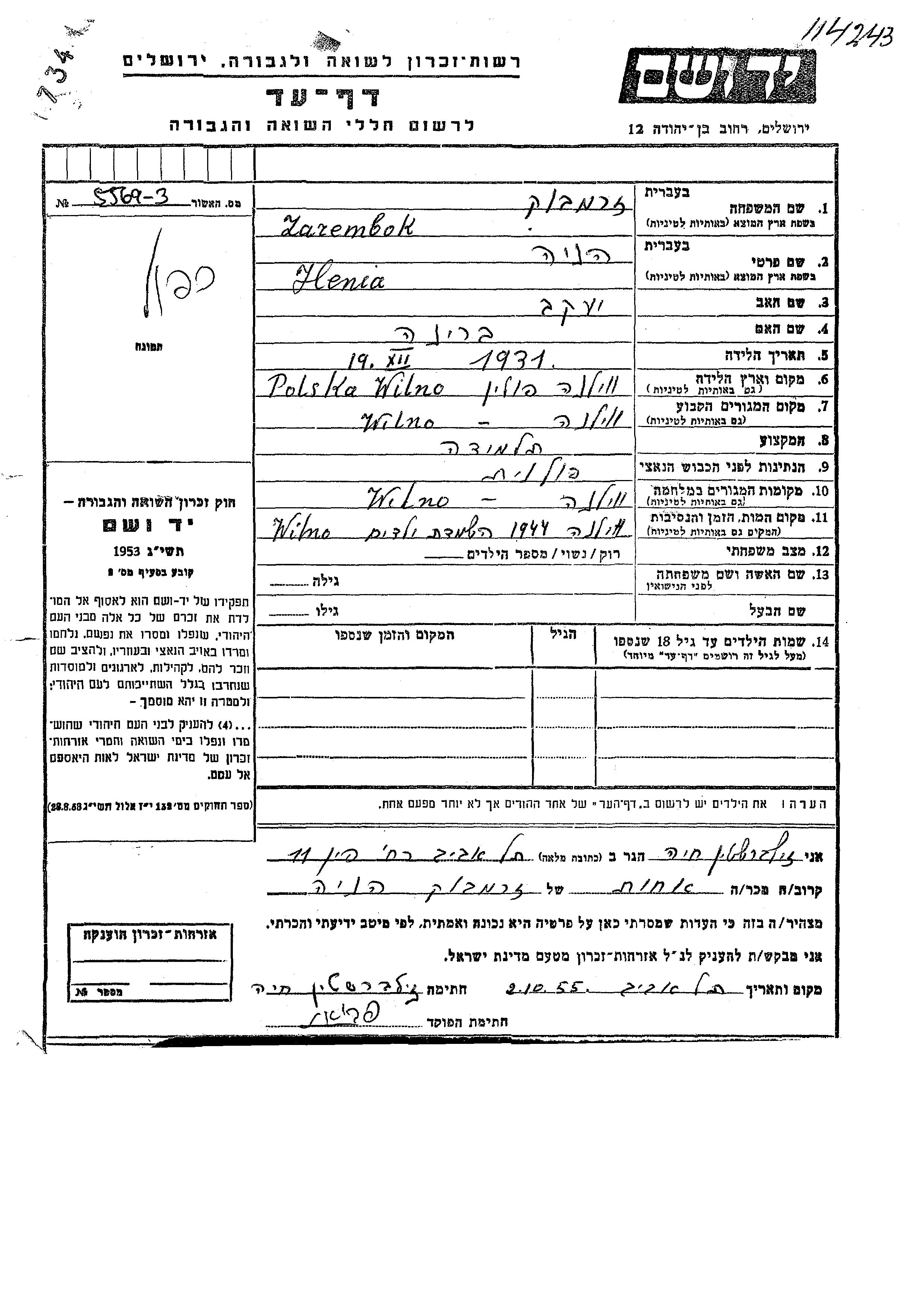 Henia Zarembok wurde im Jahr 1931 in Wilno, Polen geboren. Sie war Schüler/-in. Vor dem Zweiten Weltkrieg lebte sie in Wilno, Polen.