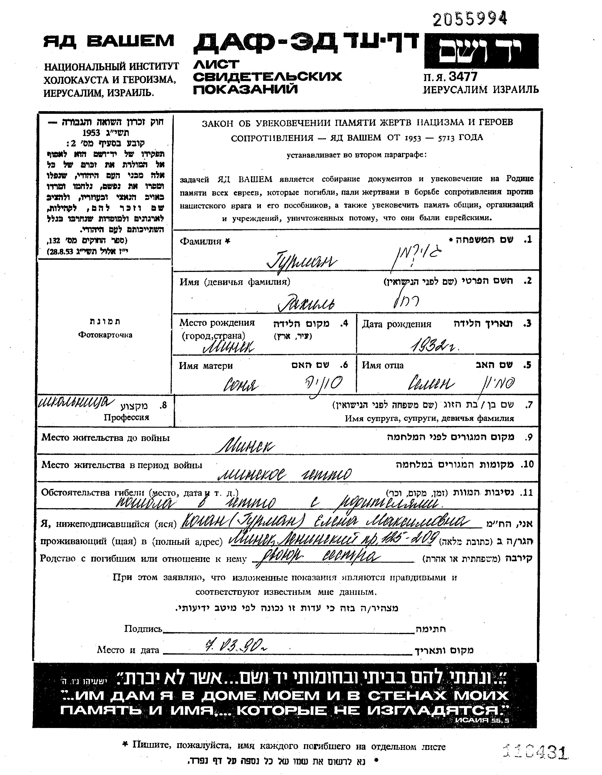Gurman | Rakhil | 1932 | Minsk, Weißrussland (UdSSR) | Gedenkblatt |