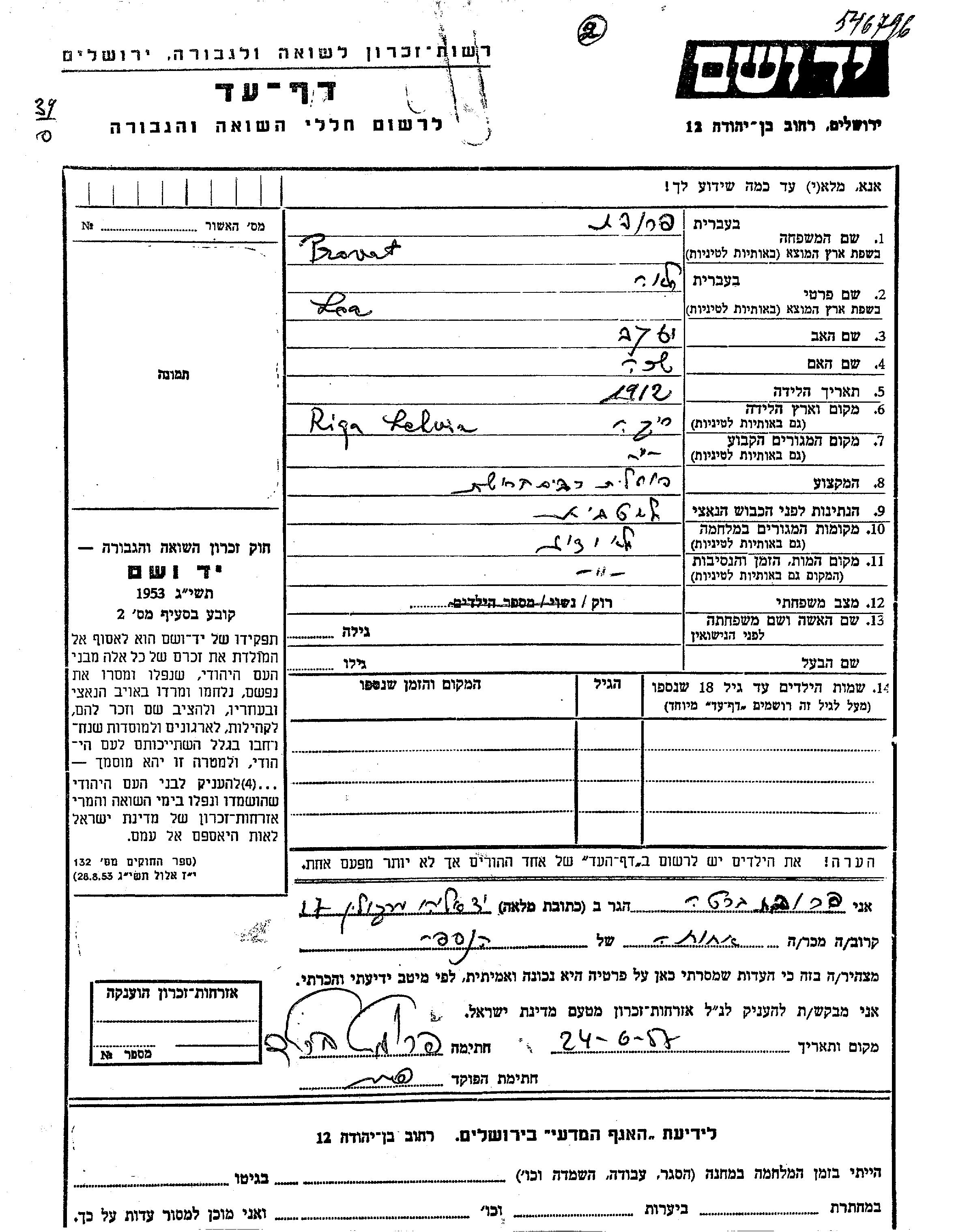 Lea Lina Provet Provat wurde im Jahr 1912 in Riga, Lettland geboren. Sie war Fabrikarbeiter / fabrikarbeiterin. Vor dem Zweiten Weltkrieg lebte sie in Riga, Lettland.
