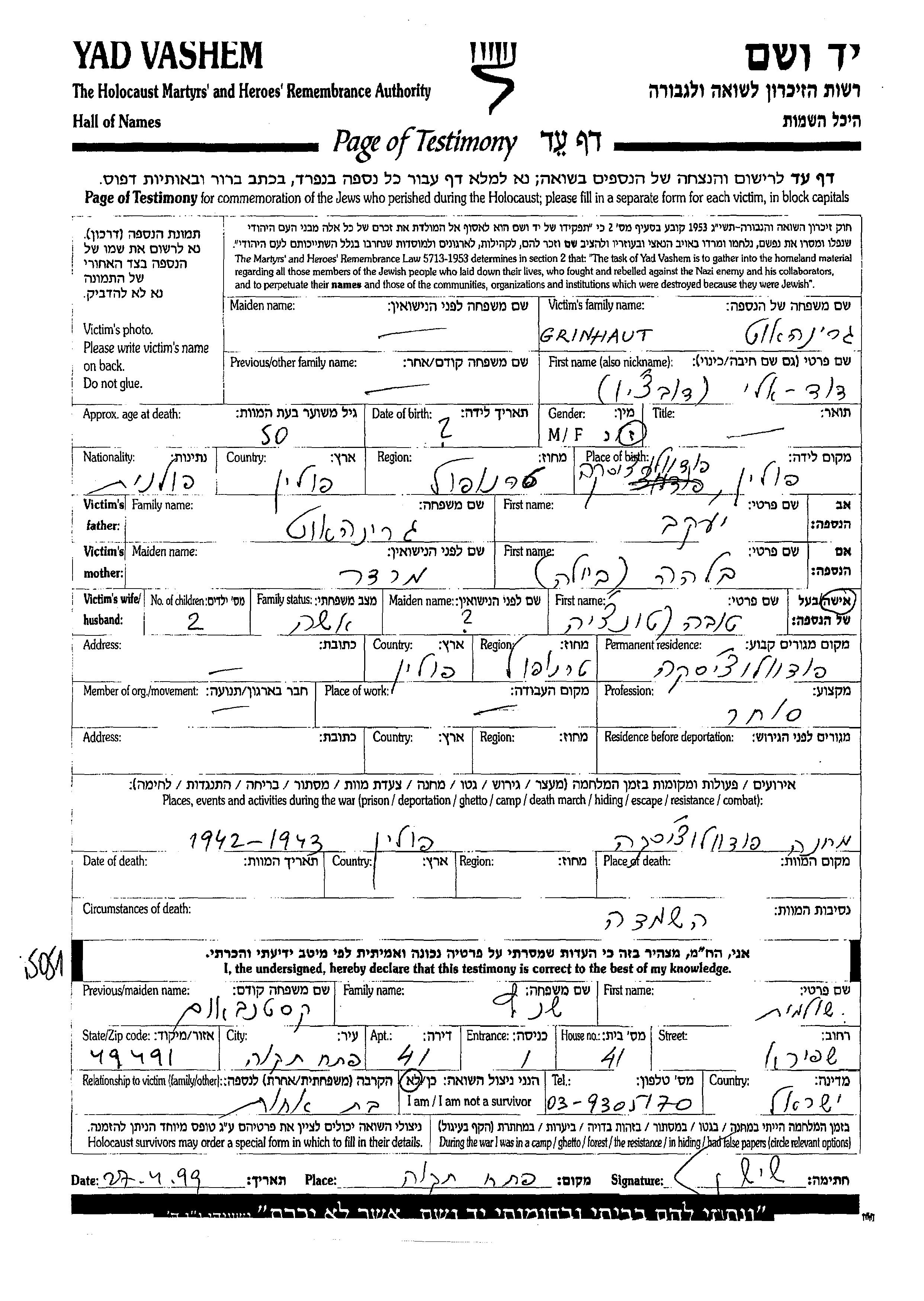 Grinhaut David Eli Podwoloczyska, Polen Gedenkblatt