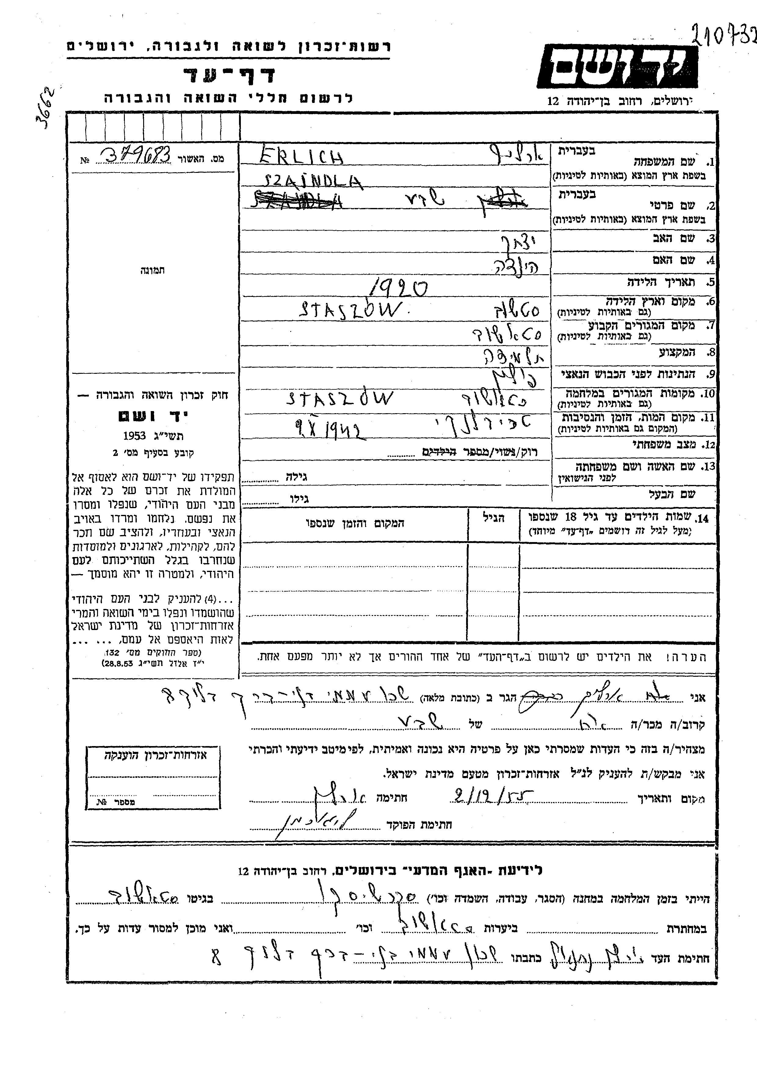 Szajndla Batsheva Herlich Erlich wurde im Jahr 1920 in Staszow, Polen geboren. Vor dem Zweiten Weltkrieg lebte sie in Staszow, Polen.