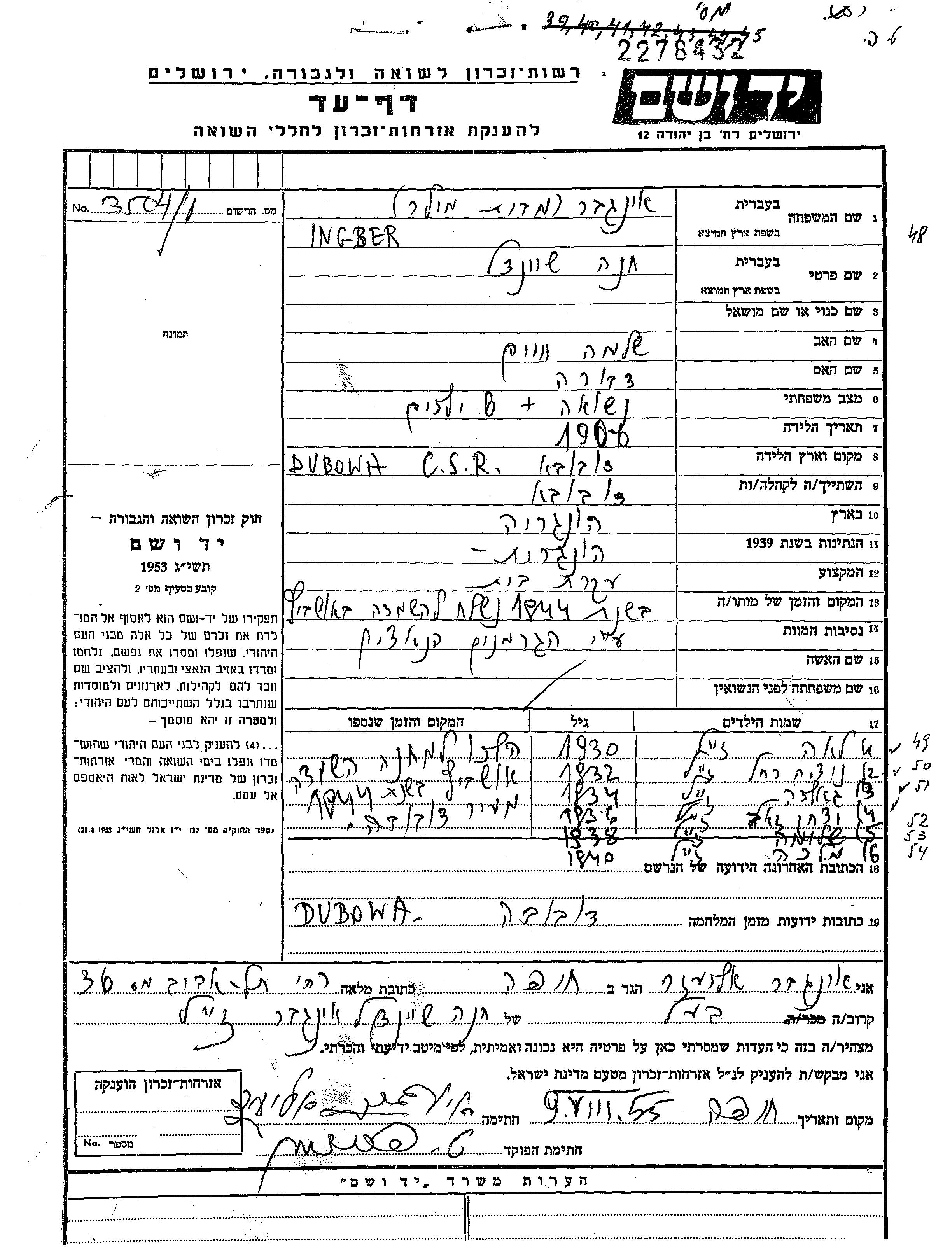 Sheindel Khana Ingber, geb. Miler wurde im Jahr 1906 in Dubova, Tschechoslowakei geboren. Vor dem Zweiten Weltkrieg lebte sie in Dubova, Tschechoslowakei.