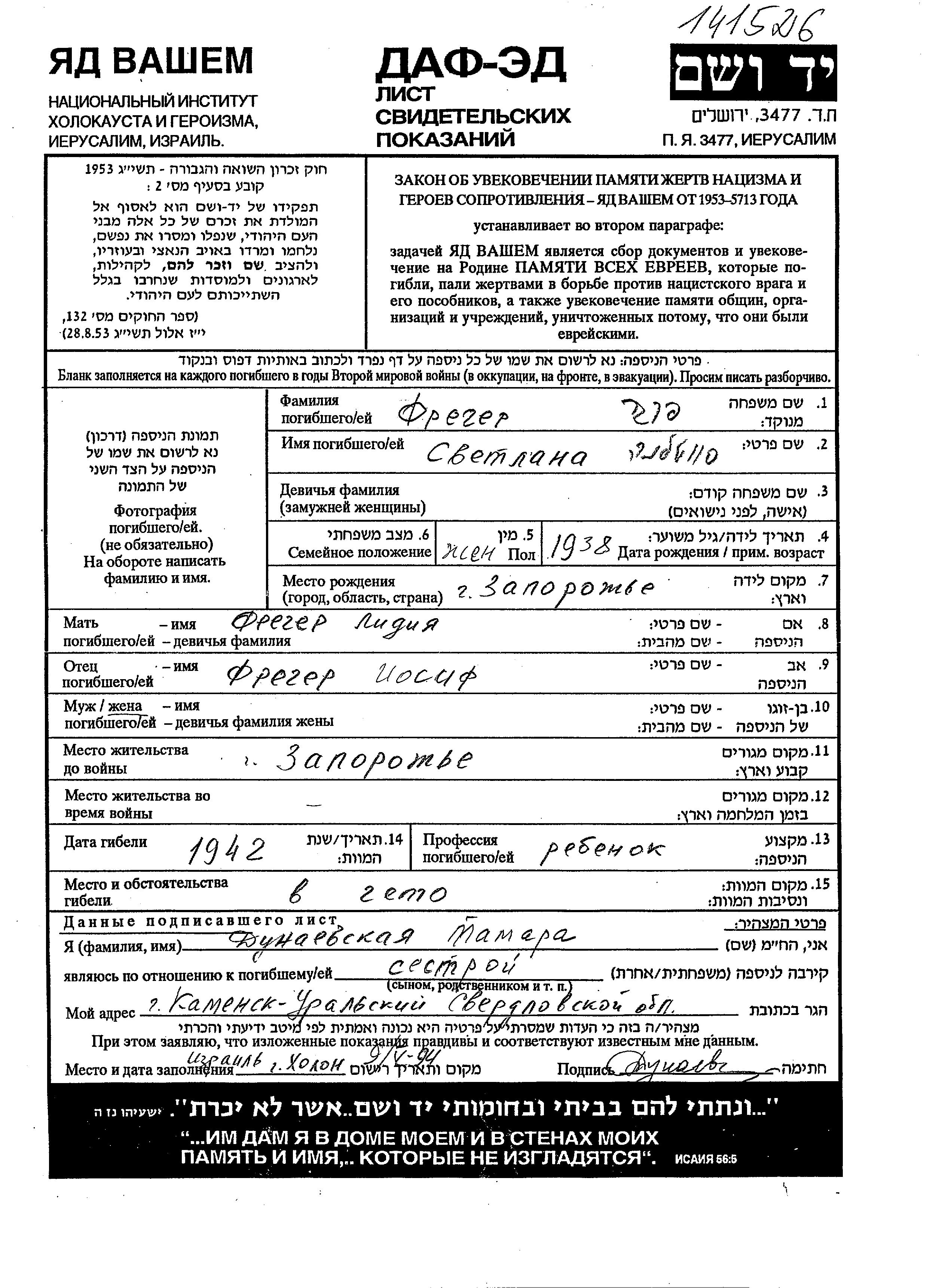 | Freger Prager | Svetlana | 1938 | Zaporozhye, Ukraine (UdSSR) | Gedenkblatt |