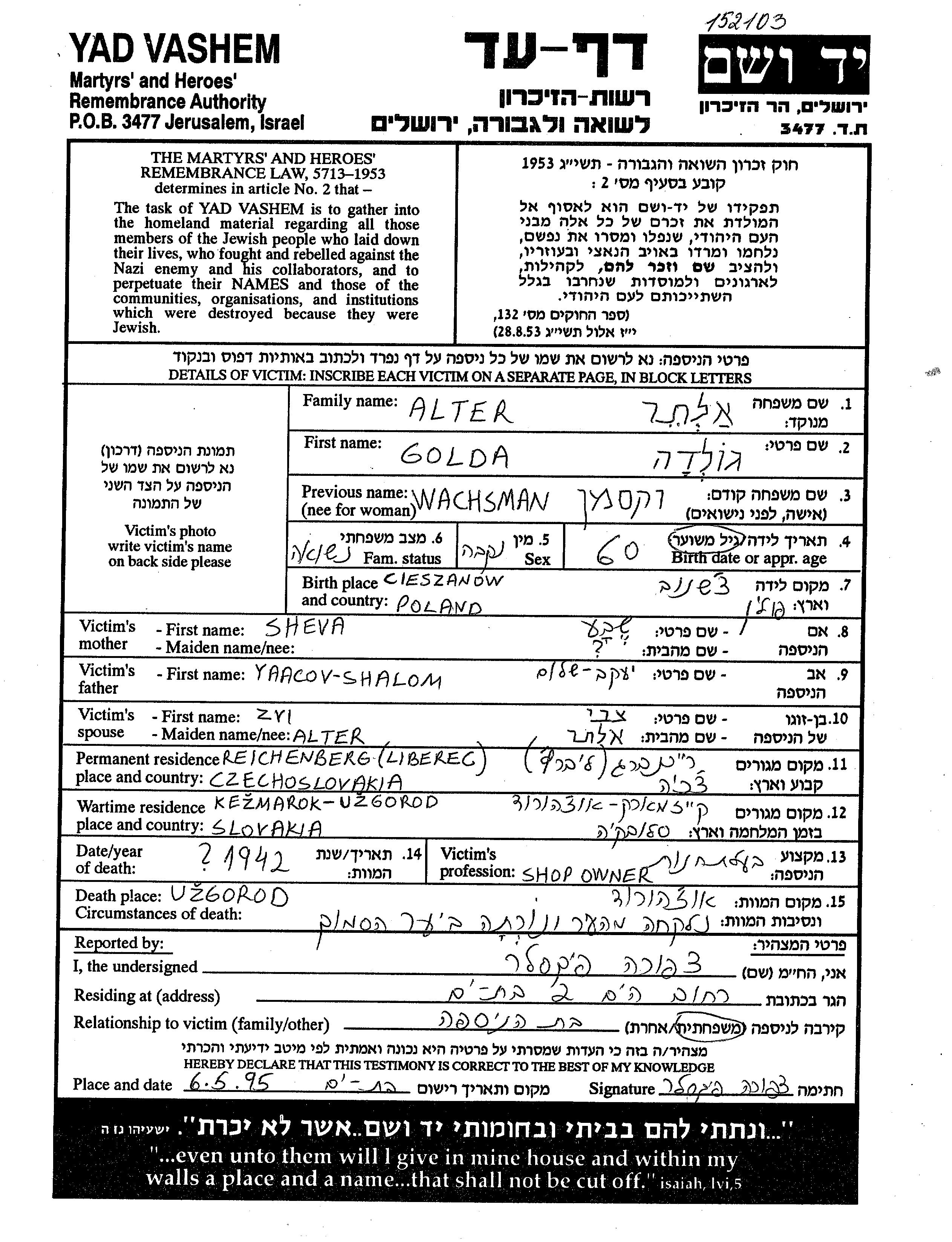 Golda Alter, geb. Wachsman wurde im Jahr 1881 in Cieszanow, Polen geboren. Sie war Ladenbesitzer/-in. Vor dem Zweiten Weltkrieg lebte sie in Reichenberg, Tschechoslowakei.