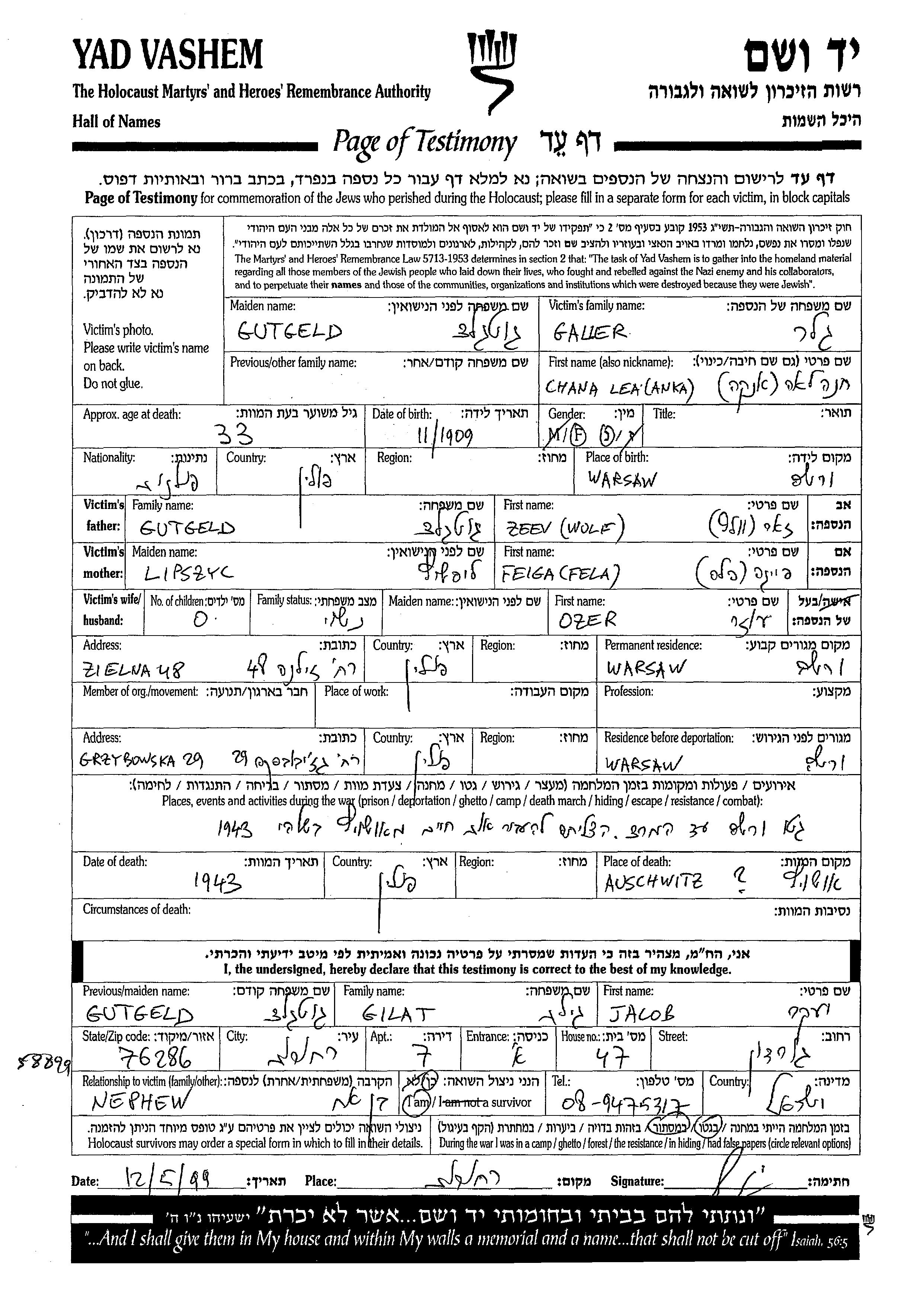 Galler | Chana Anka Lea | 1909 | Warszawa, Polen | Gedenkblatt |