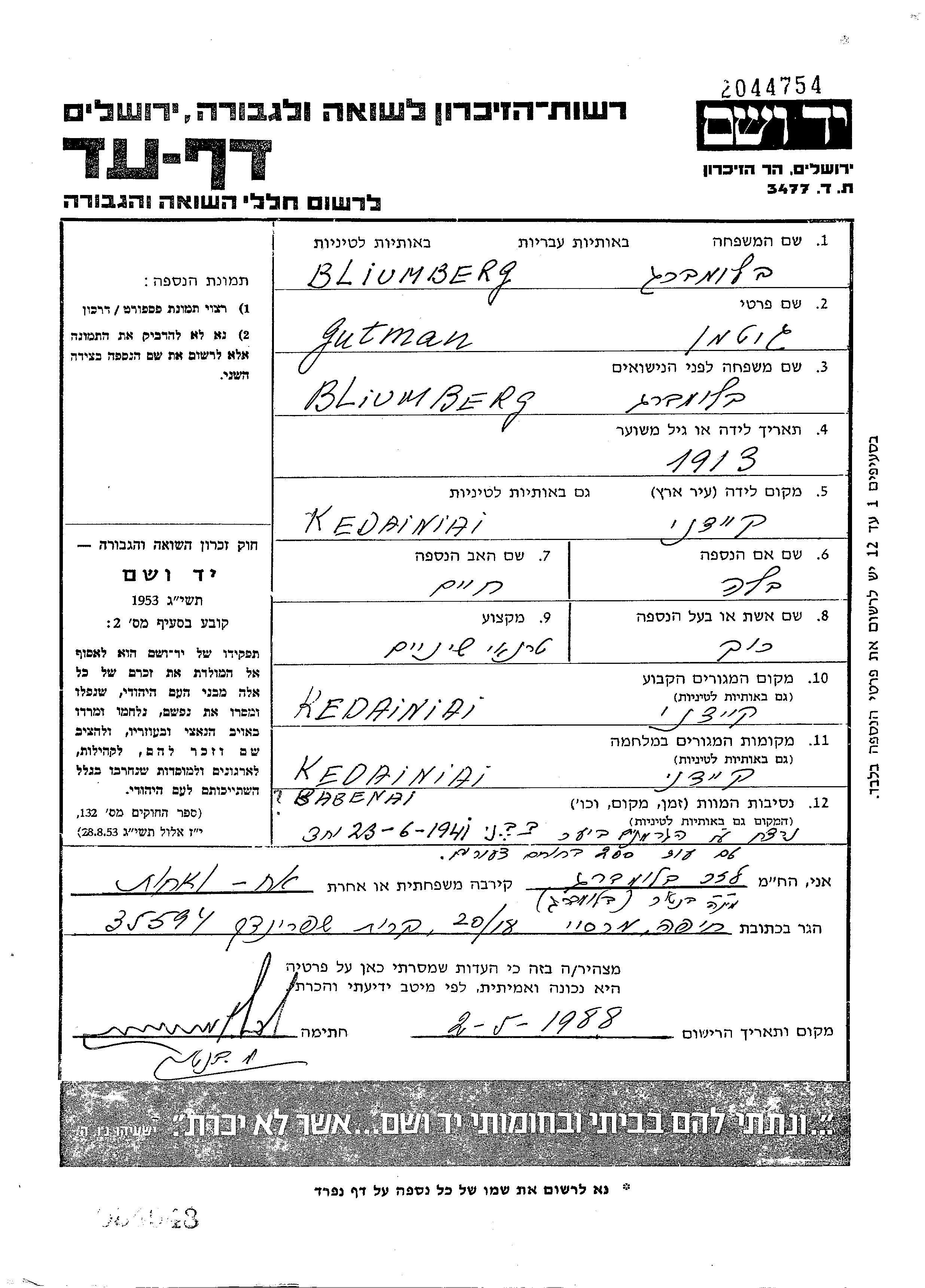 Gutman Bliumberg wurde im Jahr 1913 in Kedainiai, Litauen geboren. Er war Zahntechniker/-in. Vor dem Zweiten Weltkrieg lebte er in Kedainiai, Litauen.