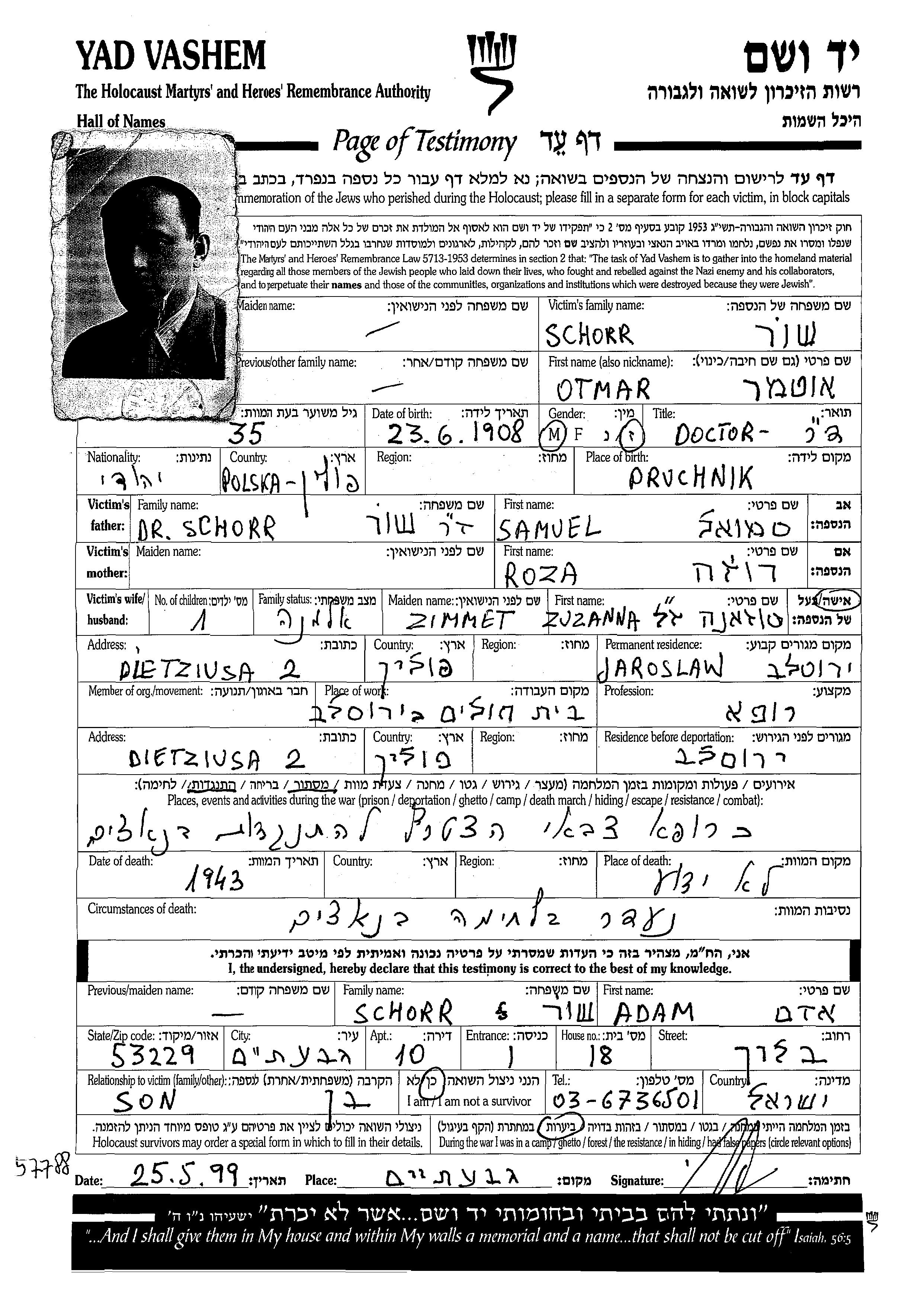 Otmar Schorr wurde im Jahr 1908 in Pruchnik, Polen geboren. Er war Arzt/ärztin. Vor dem Zweiten Weltkrieg lebte er in Jaroslaw, Polen.