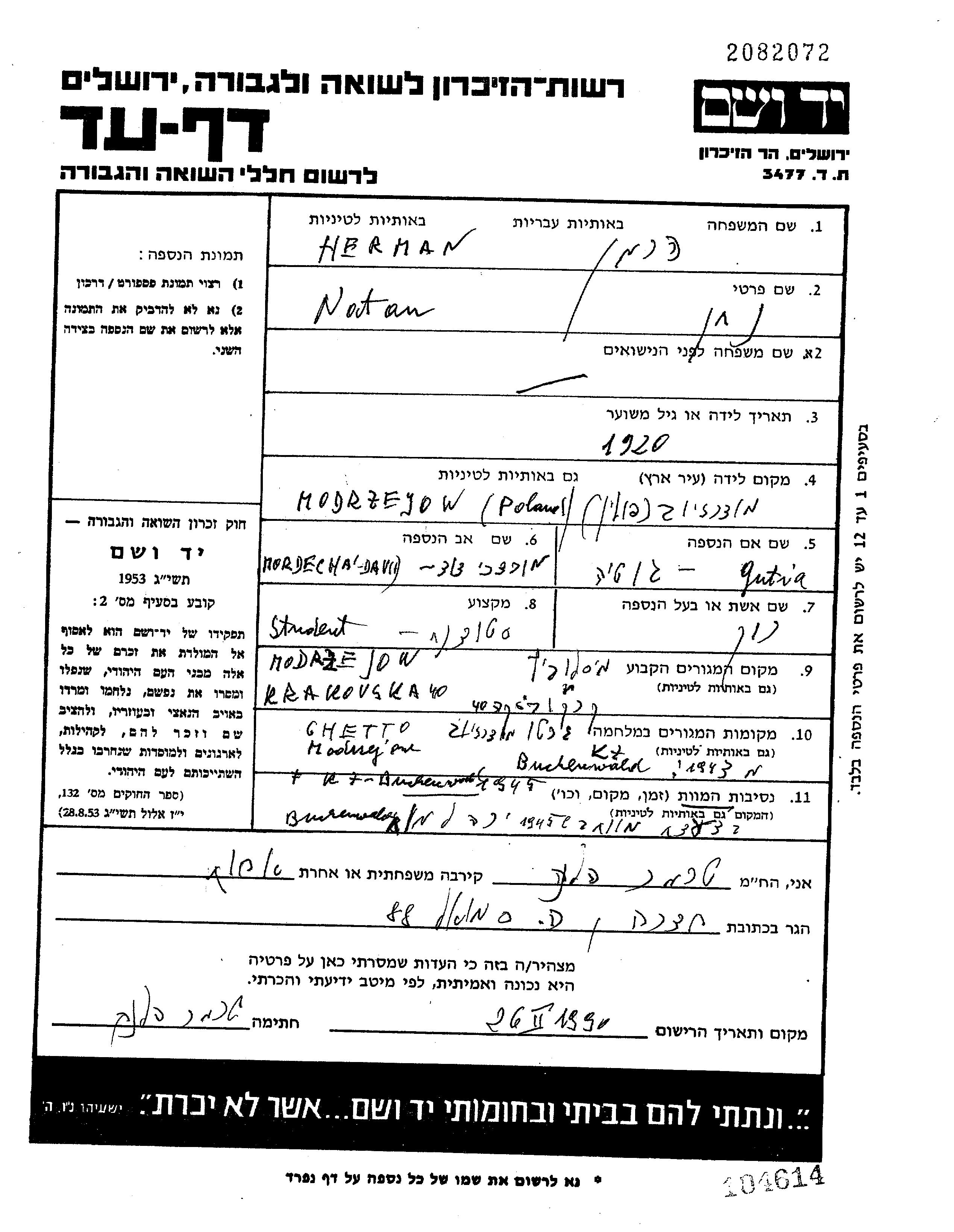 Natan Herman wurde im Jahr 1919 in Modrzejow, Polen geboren. Vor dem Zweiten Weltkrieg lebte er in Modrzejow, Polen.