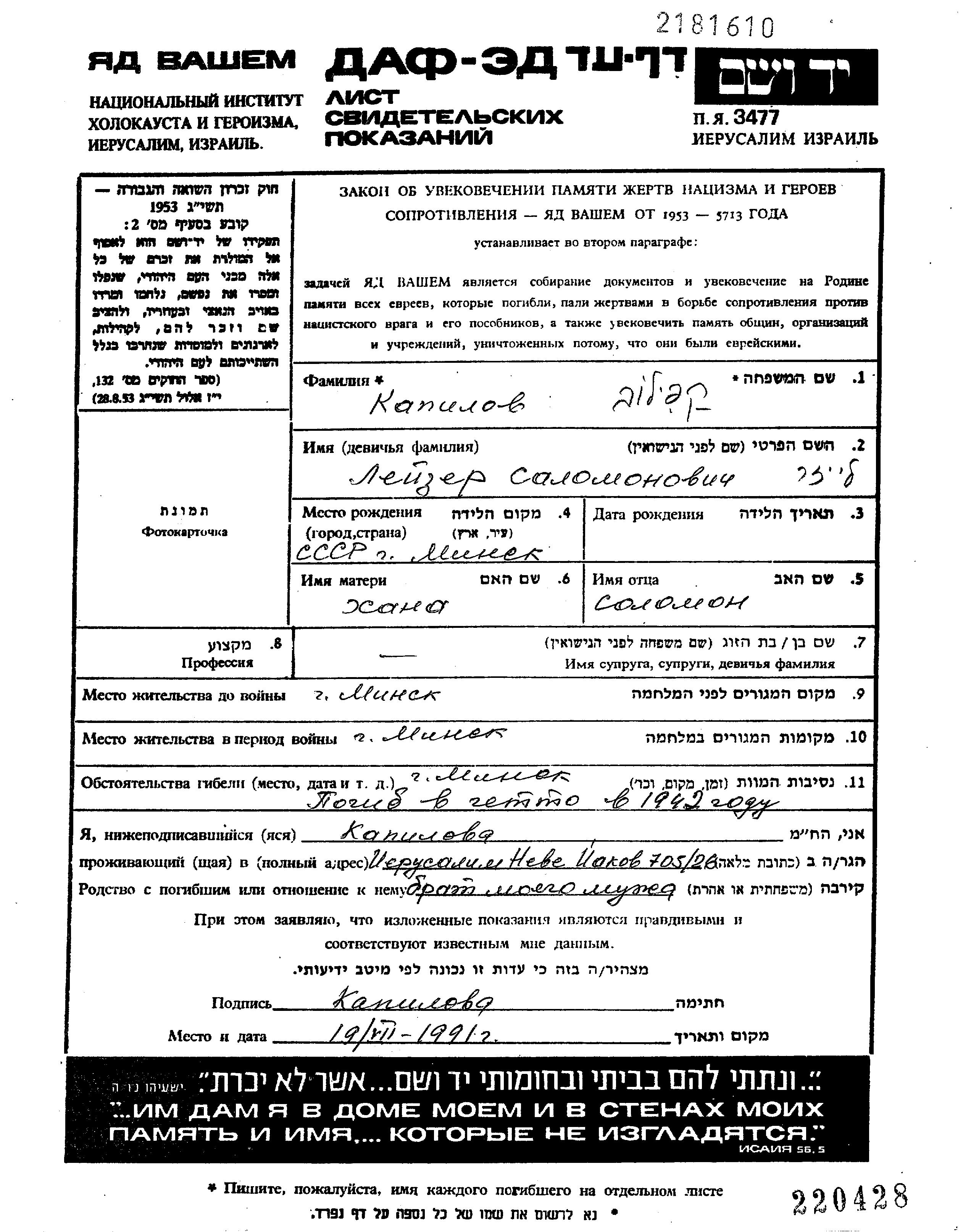 Kapilov | Lazar | Minsk, Weißrussland (UdSSR) | Gedenkblatt |