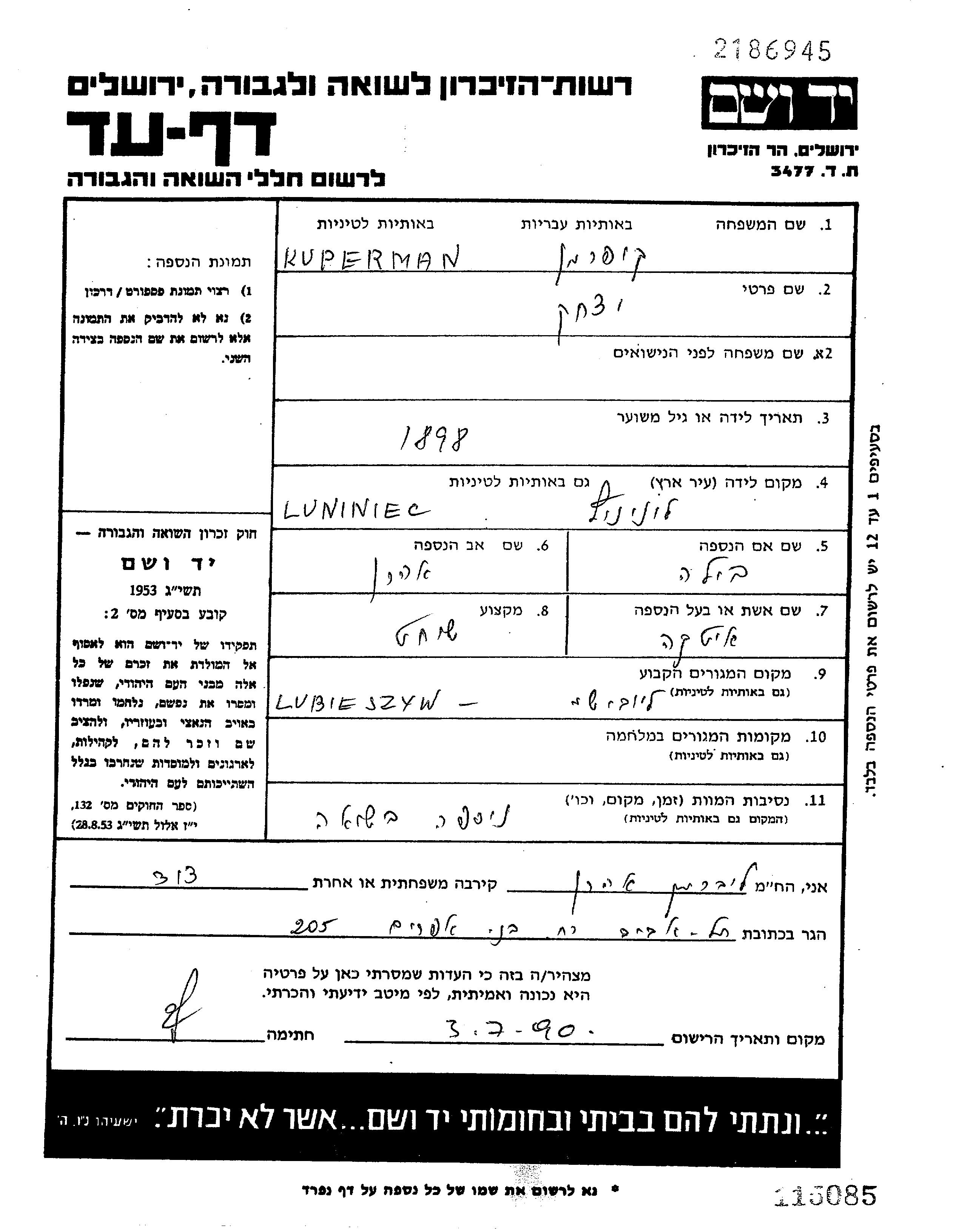 Yitzkhak Kuperman wurde im Jahr 1898 in Luniniec, Polen geboren. Er war Schächter. Vor dem Zweiten Weltkrieg lebte er in Lubieszów, Polen.