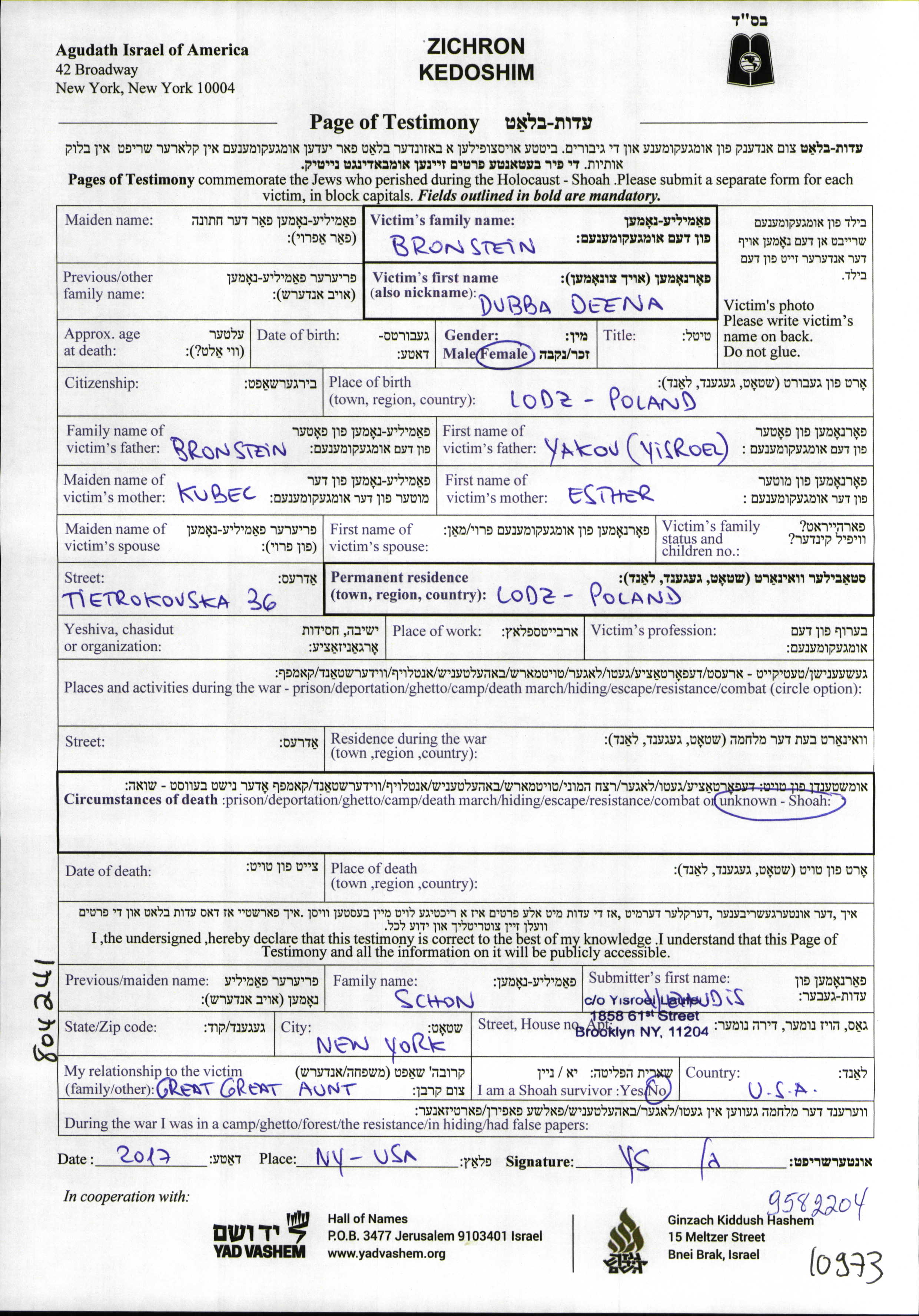 Dubba Dina Bronstein wurde in Lodz, Polen geboren. Vor dem Zweiten Weltkrieg lebte sie in Lodz, Polen.