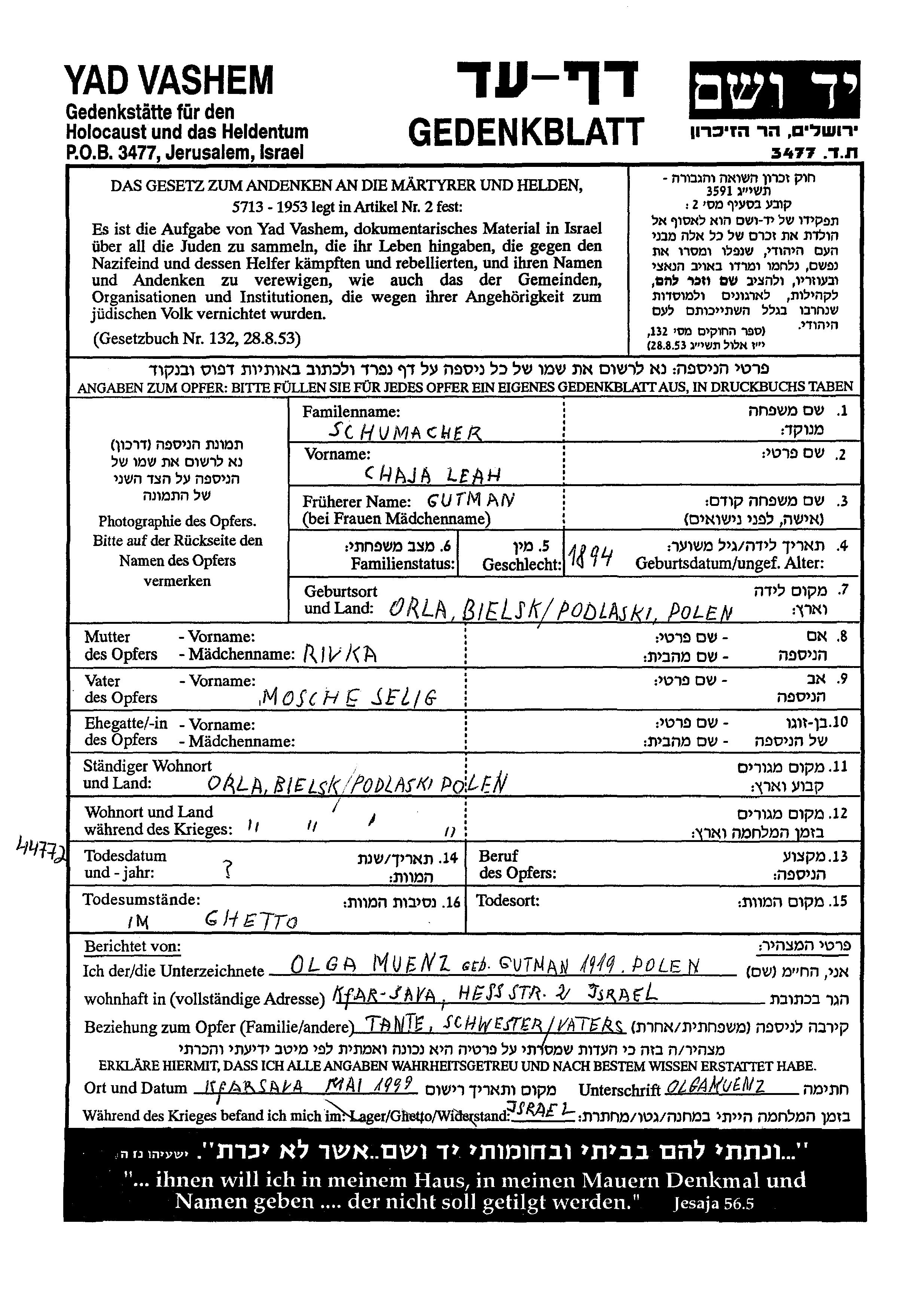 Schumacher | Leah Chaja | 1894 | Orla, Polen | Gedenkblatt |
