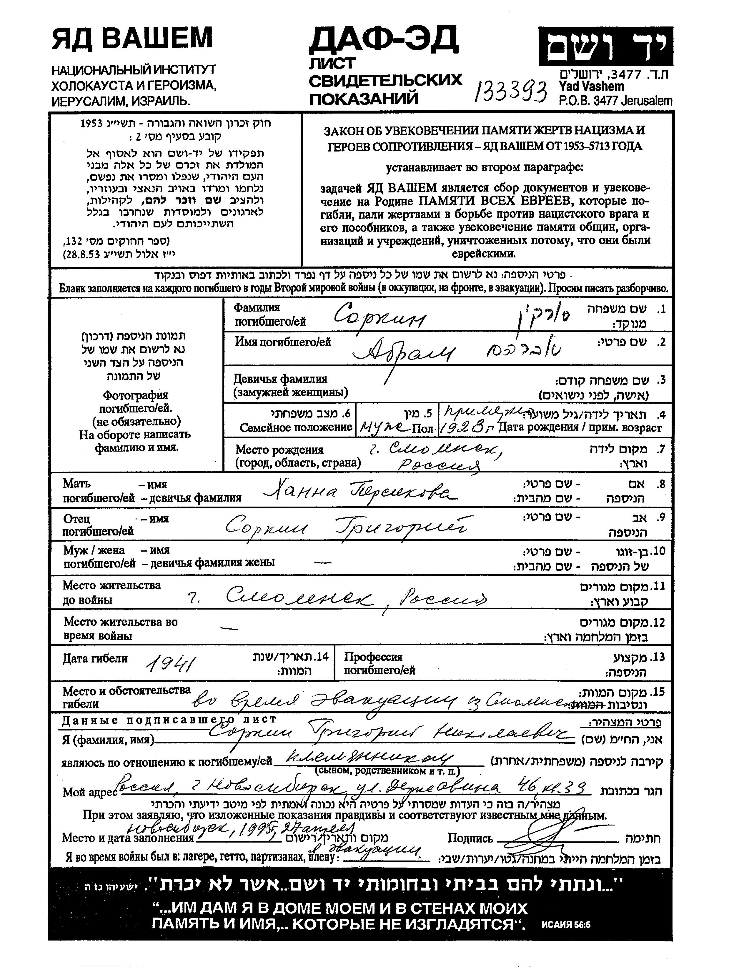 Avraham Sorkin wurde im Jahr 1927 in Smolensk, Russland (UdSSR) geboren. Er war Schüler/-in. Vor dem Zweiten Weltkrieg lebte er in Smolensk, Russland (UdSSR).