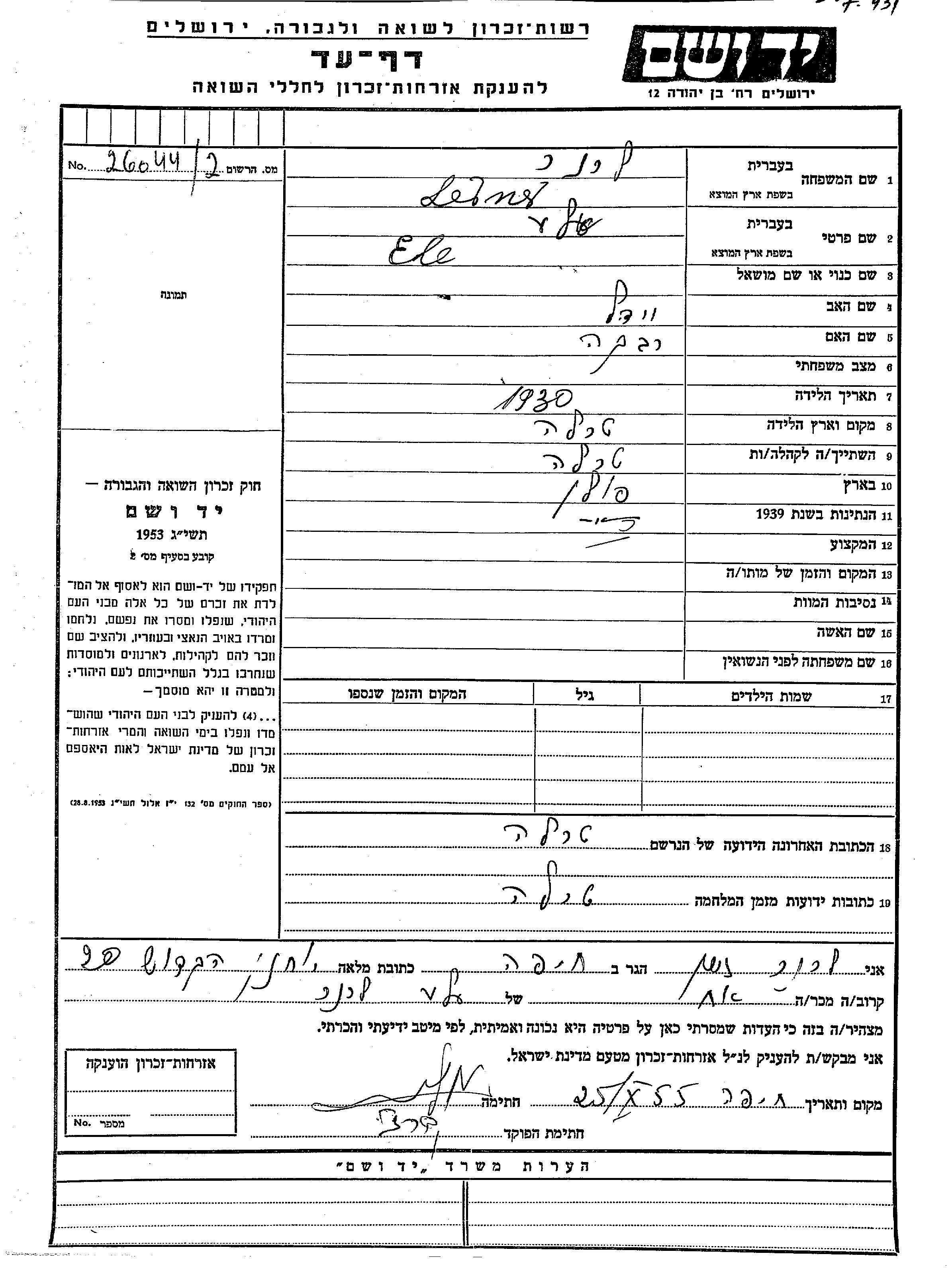 Ele Lerner wurde im Jahr 1930 in Tarla, Polen geboren. Vor dem Zweiten Weltkrieg lebte sie in Tarla, Polen.