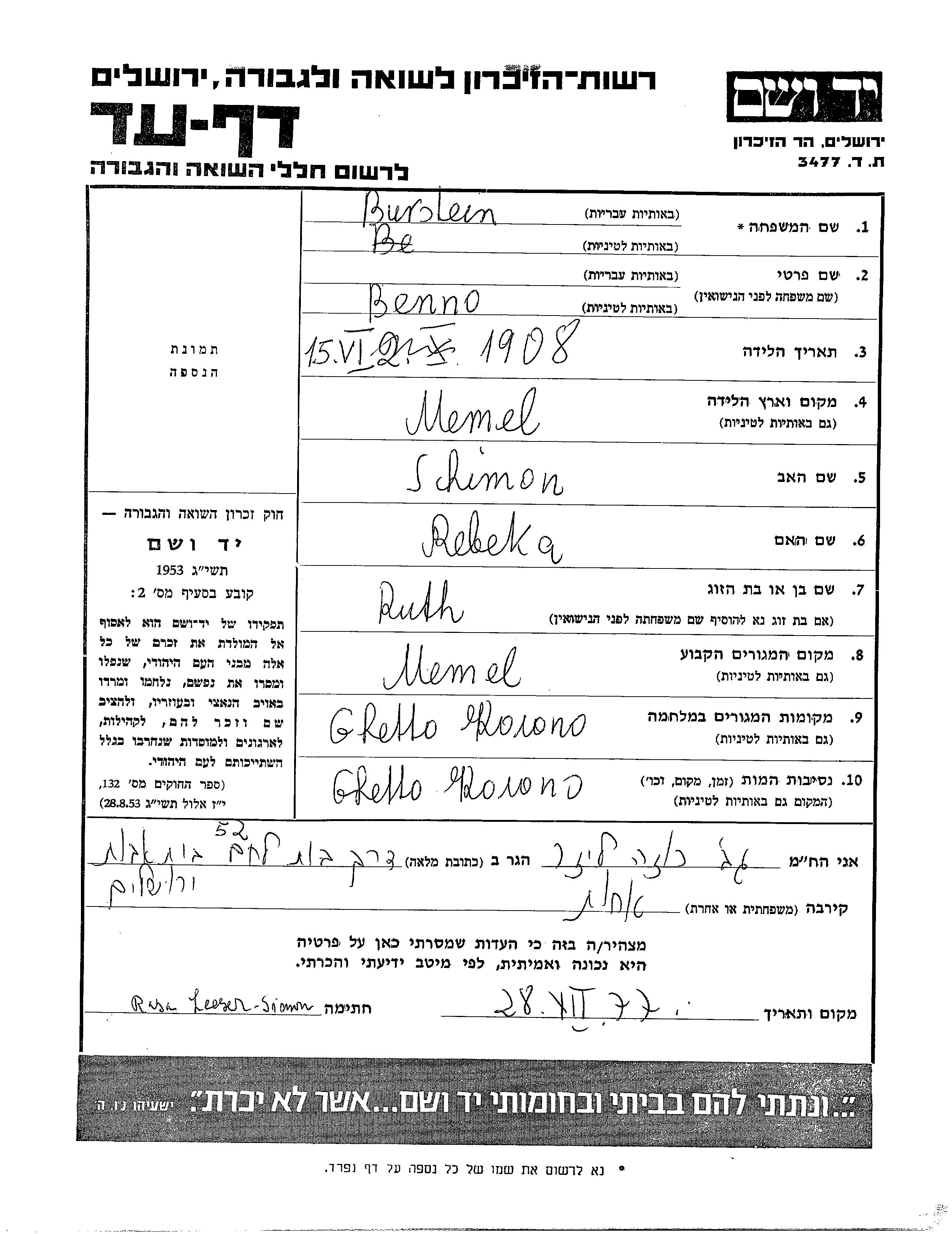 Beniamin Bentzion Burstein wurde in Memel, Litauen geboren. Vor dem Zweiten Weltkrieg lebte er in Memel, Litauen.