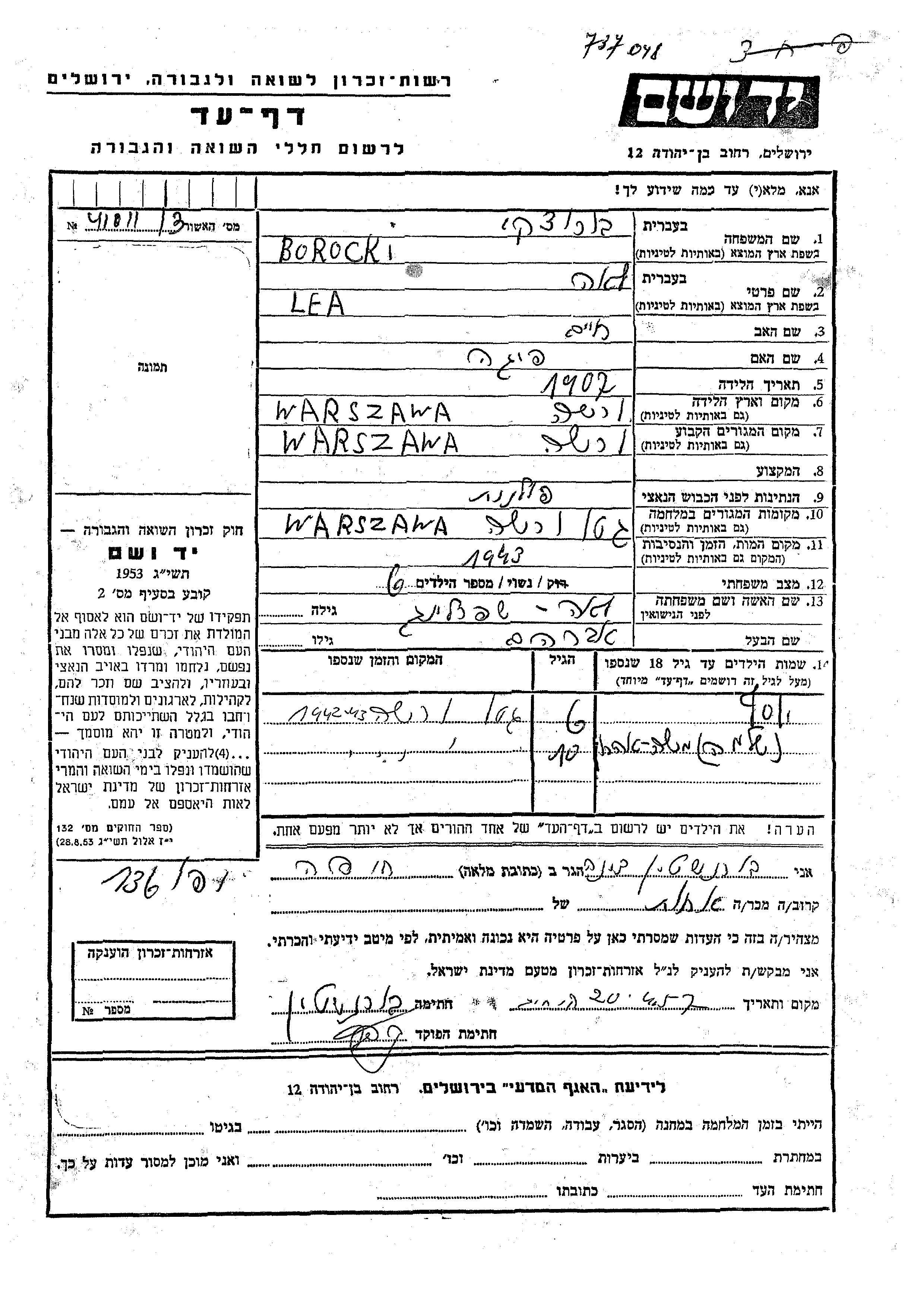 Brodzka | Lea | Warsaw, Polen | Gedenkblatt | |