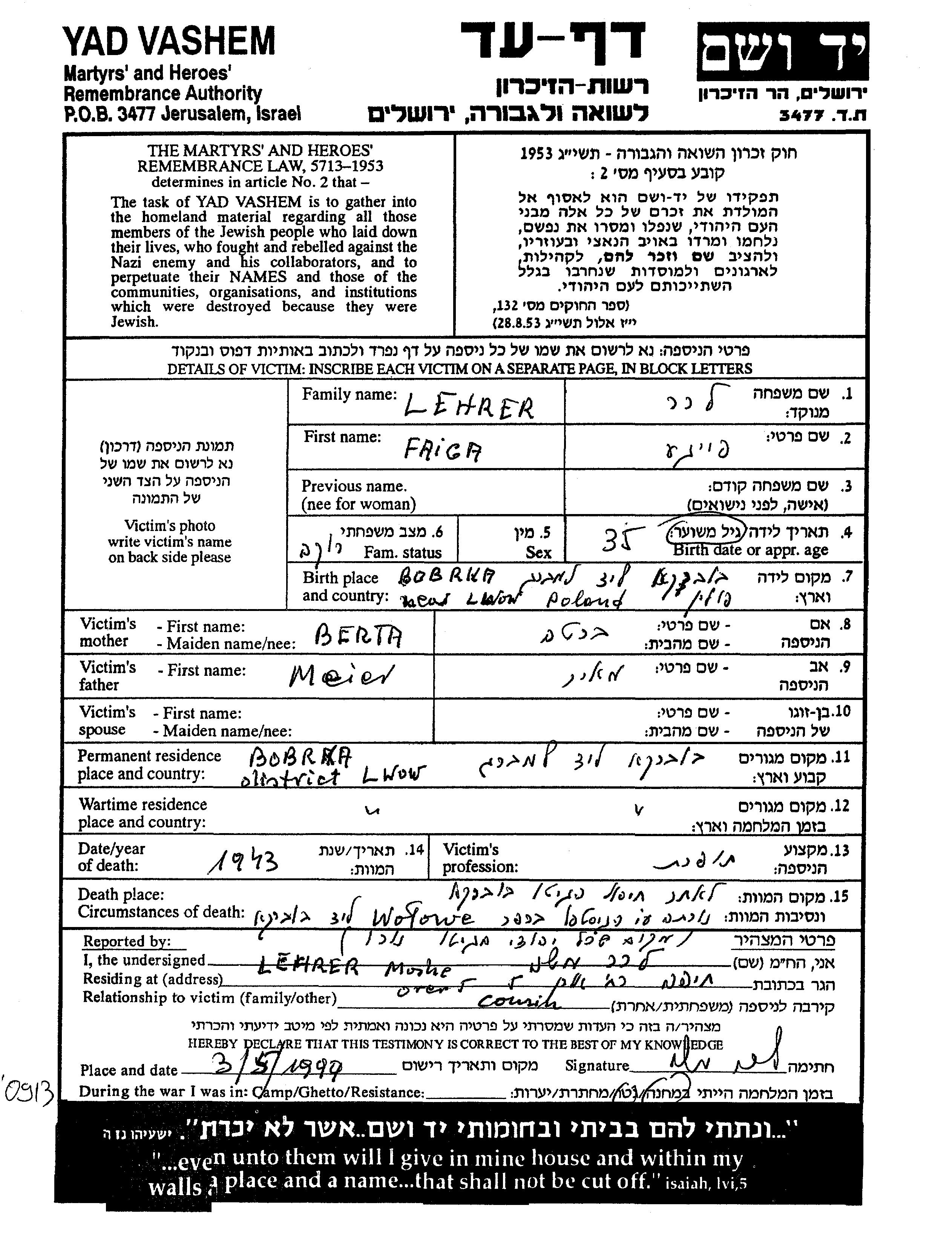 Feiga Hudel Lehrer Name unbekannt, geb. Lerer wurde in Bobrka, Polen geboren. Sie war Schneiderin. Vor dem Zweiten Weltkrieg lebte sie in Bobrka, Polen.