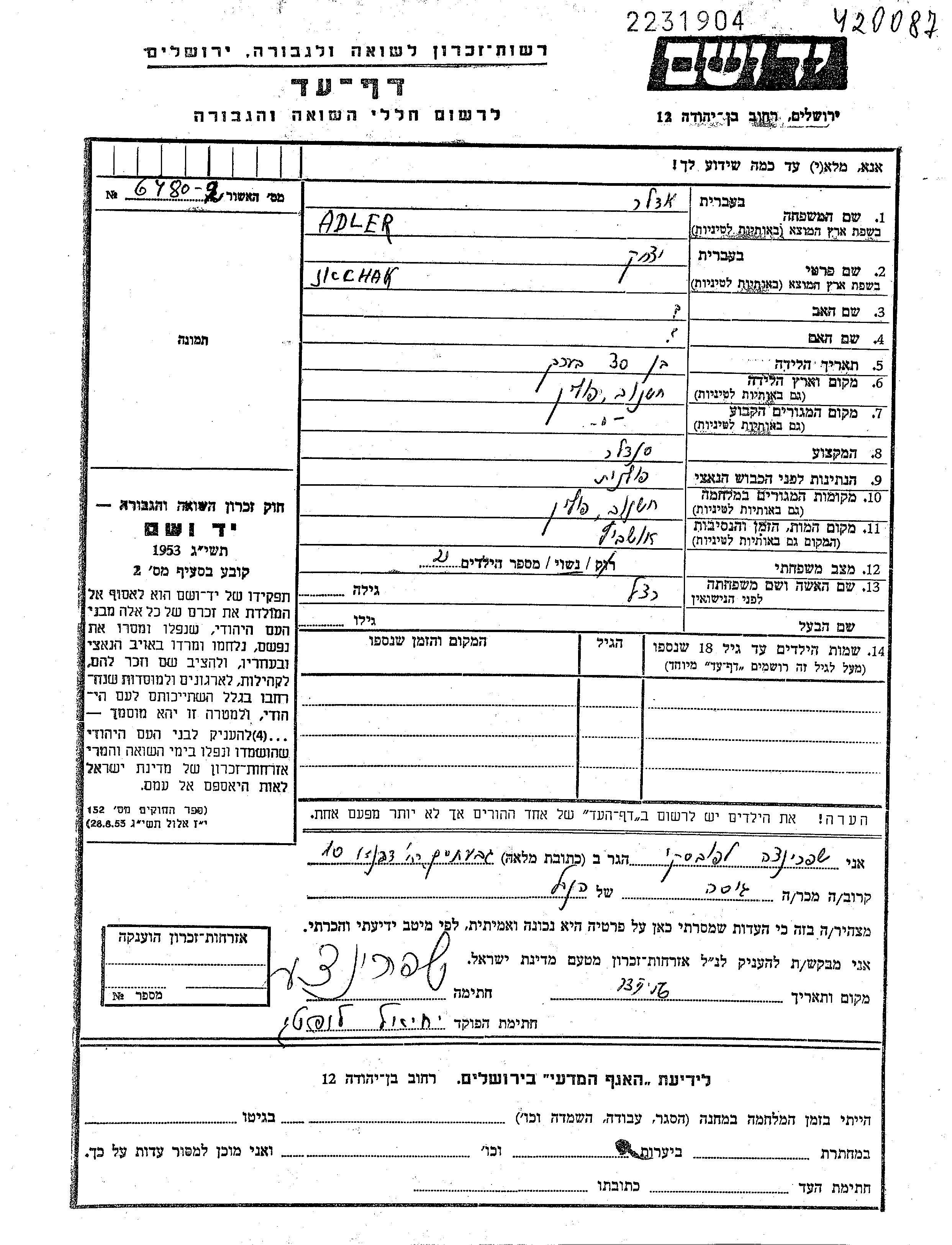 Yitzkhak Adler wurde im Jahr 1904 in Chrzanow, Polen geboren. Er war Schuster/-in. Vor dem Zweiten Weltkrieg lebte er in Chrzanow, Polen.
