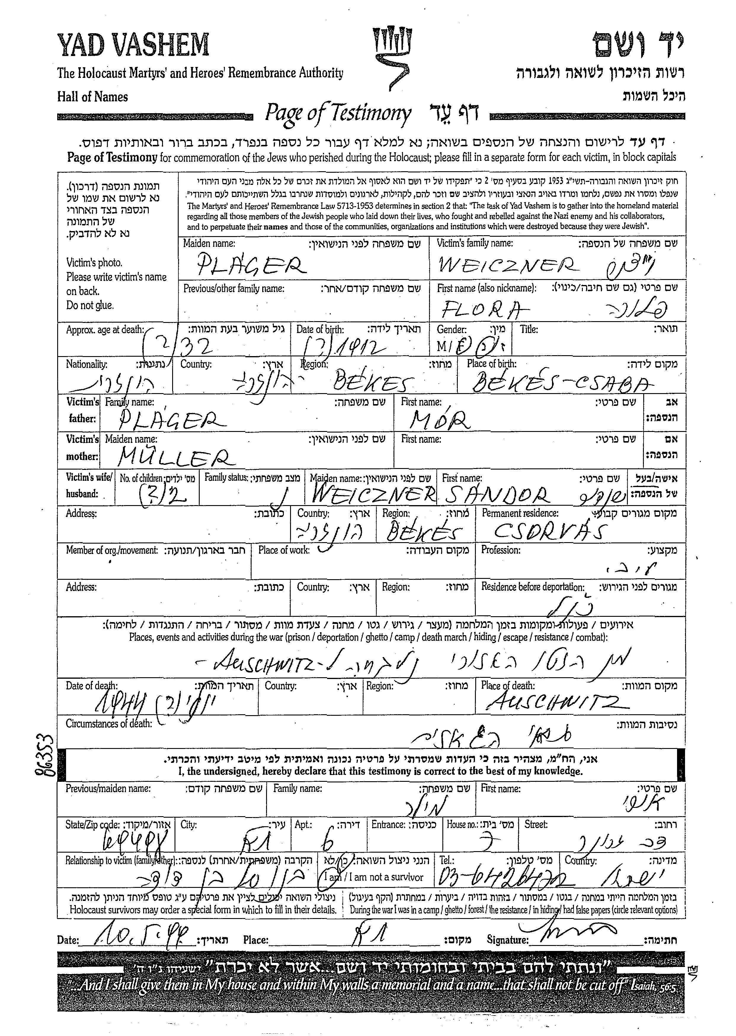 Weiczner | Flora | 1910 | Csorvas, Ungarn | Liste von ermordeten Juden aus Ungarn |