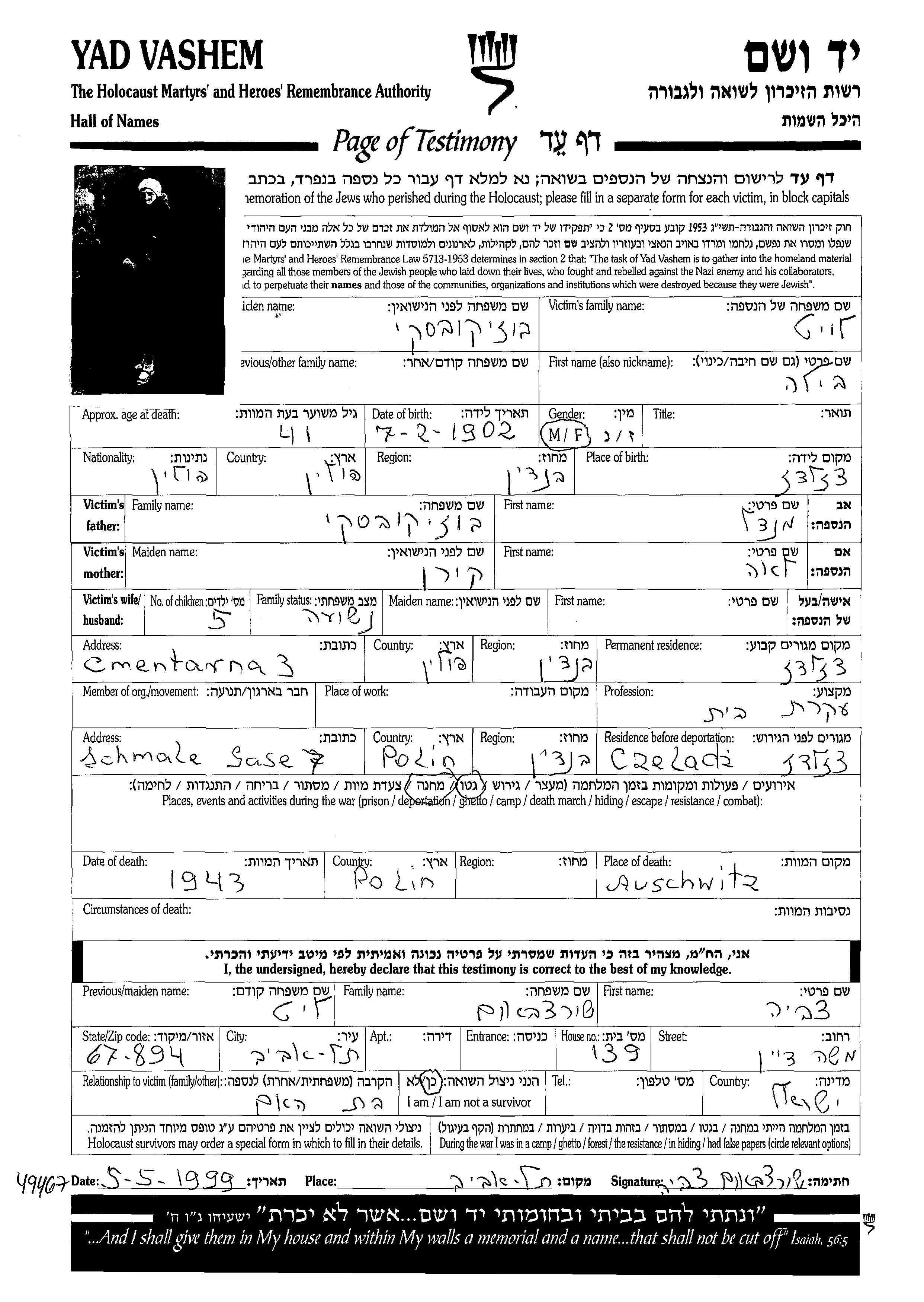 Suche nach einem Todesjahr im Zeitraum der Holocaust: 1933 bis 1945. Bitte wählen Sie 'Exakt' im Auswahlmenü, um nur nach einem einzelnen Jahr zu suchen, alternativ können Sie die flexibleren Optionen '+/- 2 Jahre' oder '+/- 5 Jahre' wählen.