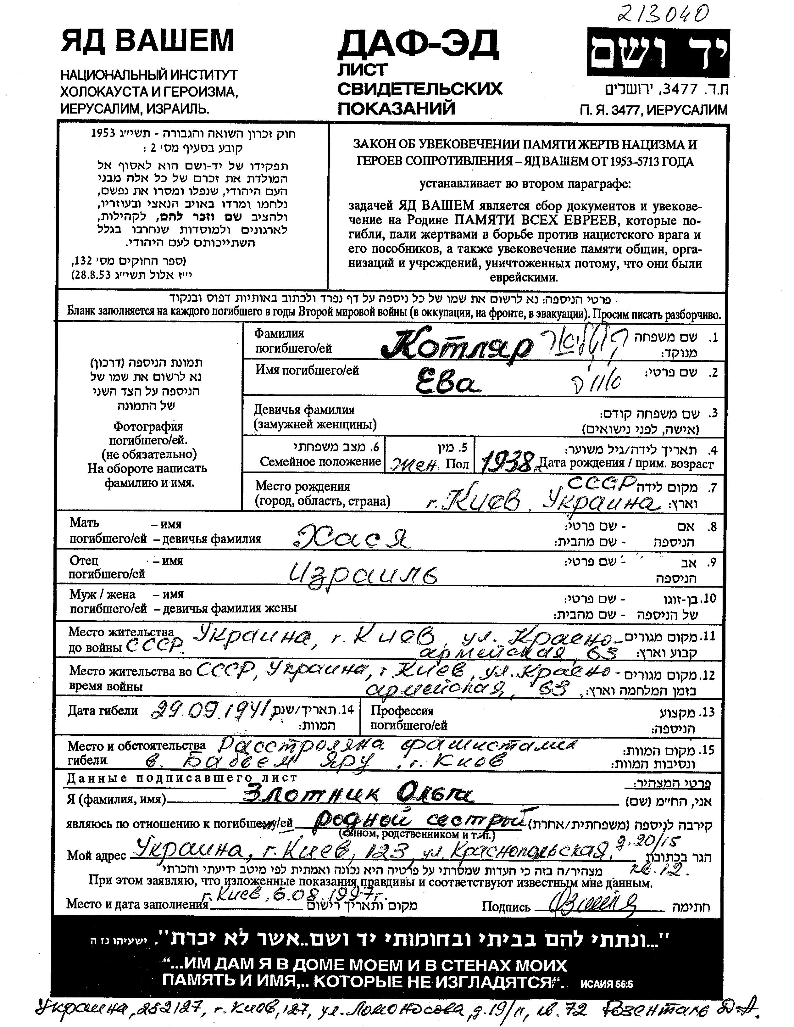 Kotlyar Eva 1938 Kiyev, Ukraine (UdSSR) Gedenkblatt