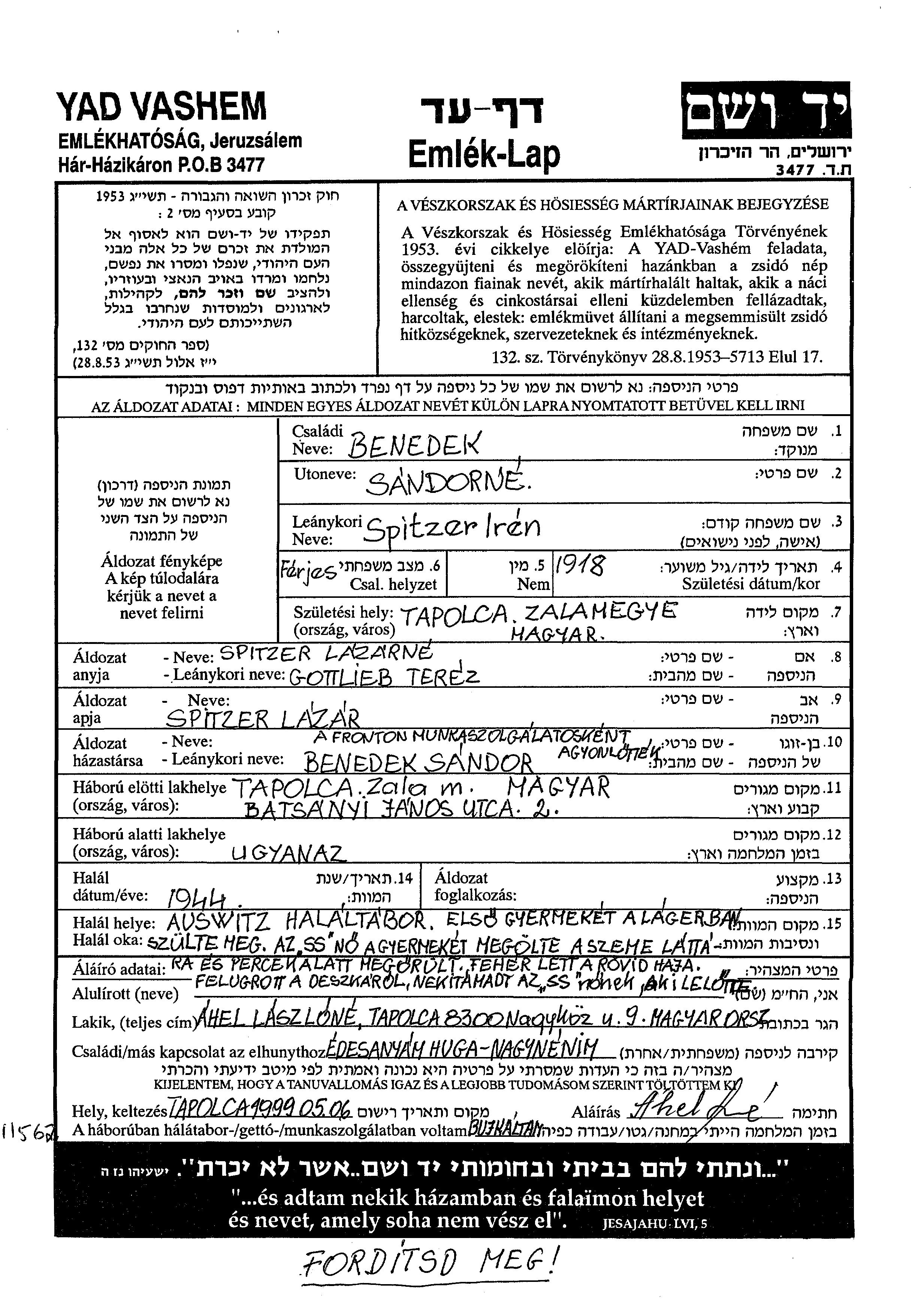 Irena Benedek, geb. Spitzer wurde im Jahr 1925 in Tapolca, Ungarn geboren. Vor dem Zweiten Weltkrieg lebte sie in Tapolca, Ungarn.