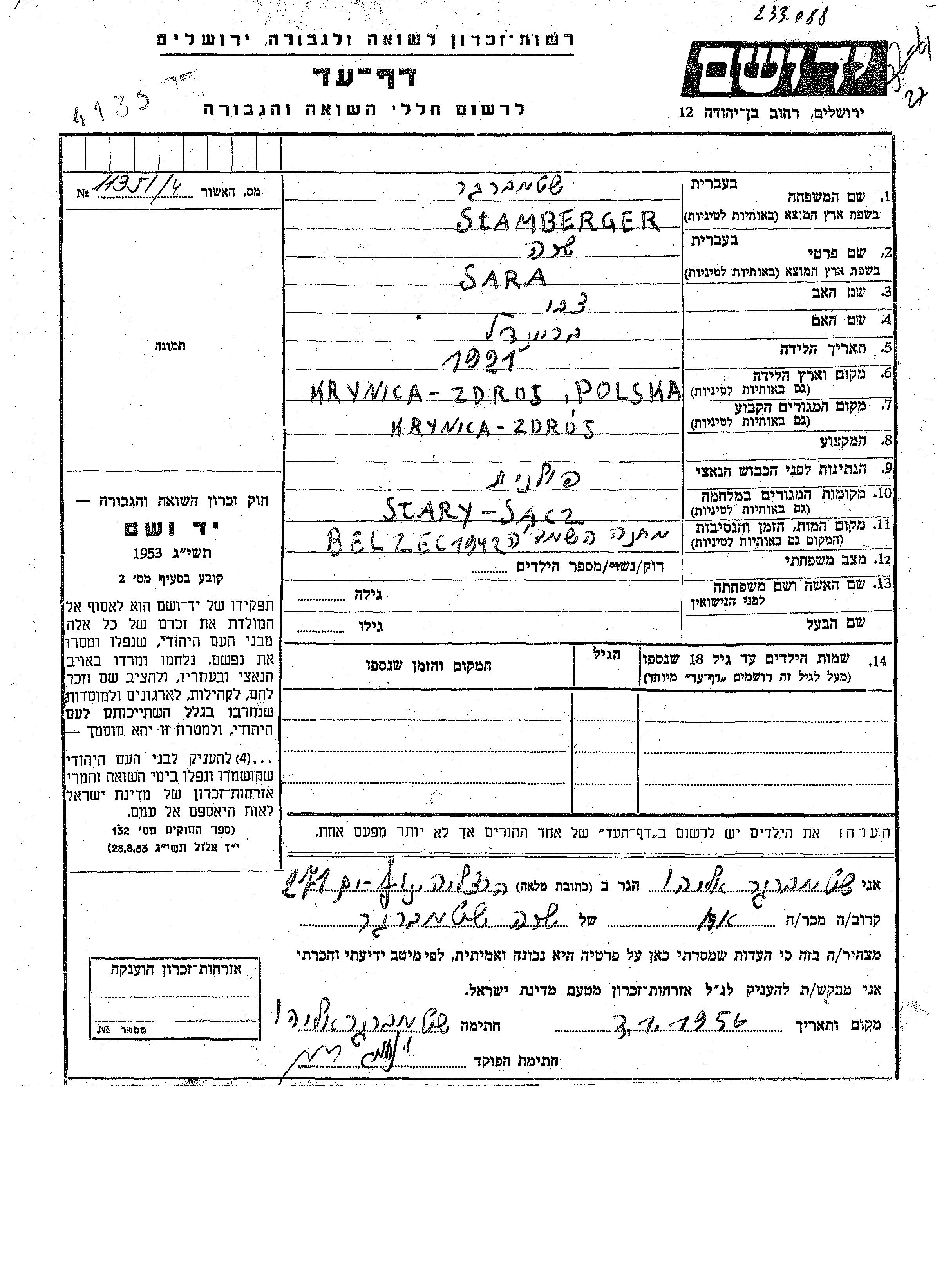 Sara Stamberger wurde im Jahr 1921 in Krynica Zdroj, Polen geboren. Vor dem Zweiten Weltkrieg lebte sie in Krynica Zdroj, Polen.