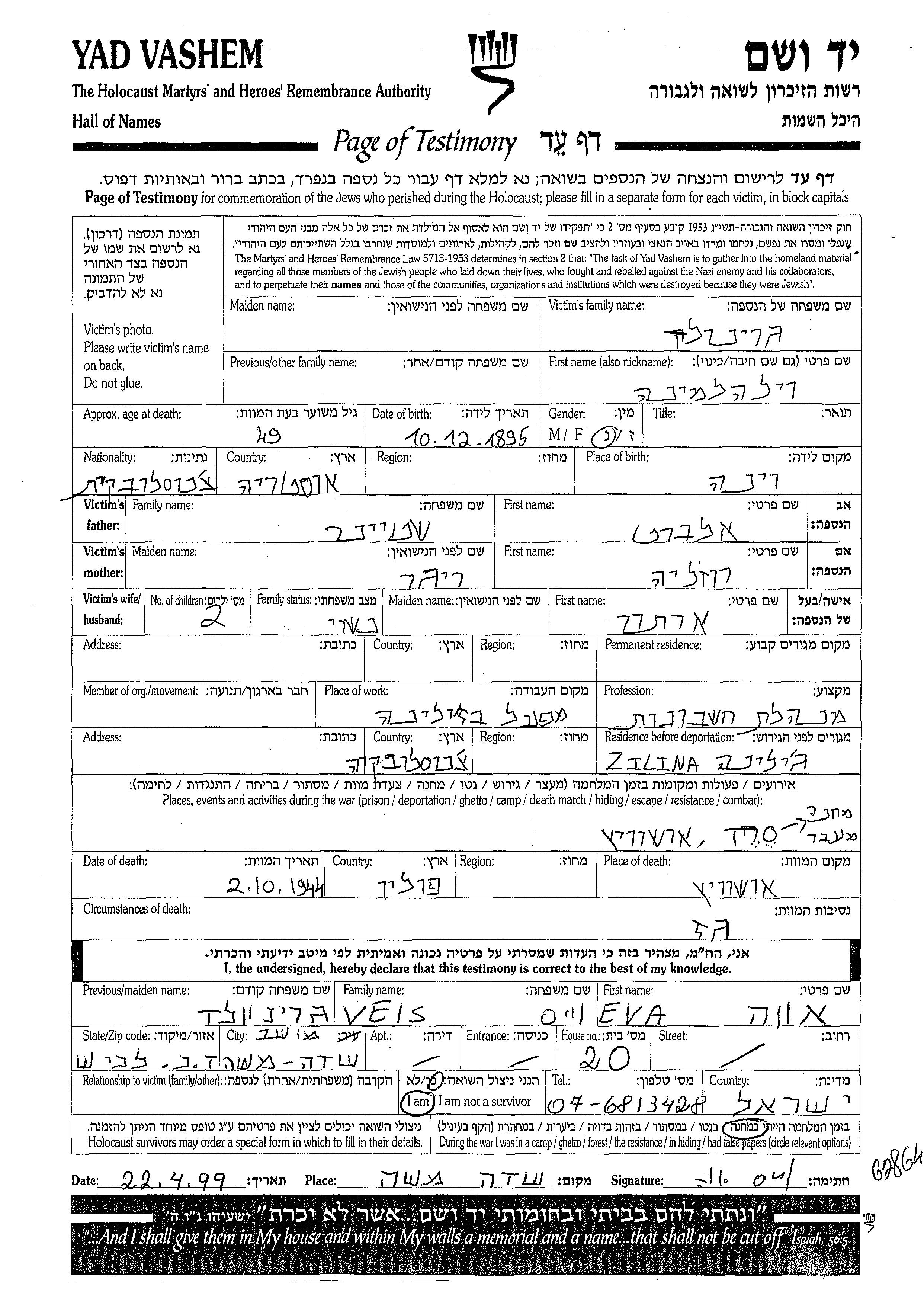 Vilhelmina wurde in der Schoah ermordet. Todesort: Auschwitz, Polen im Jahr 02/10/1944.