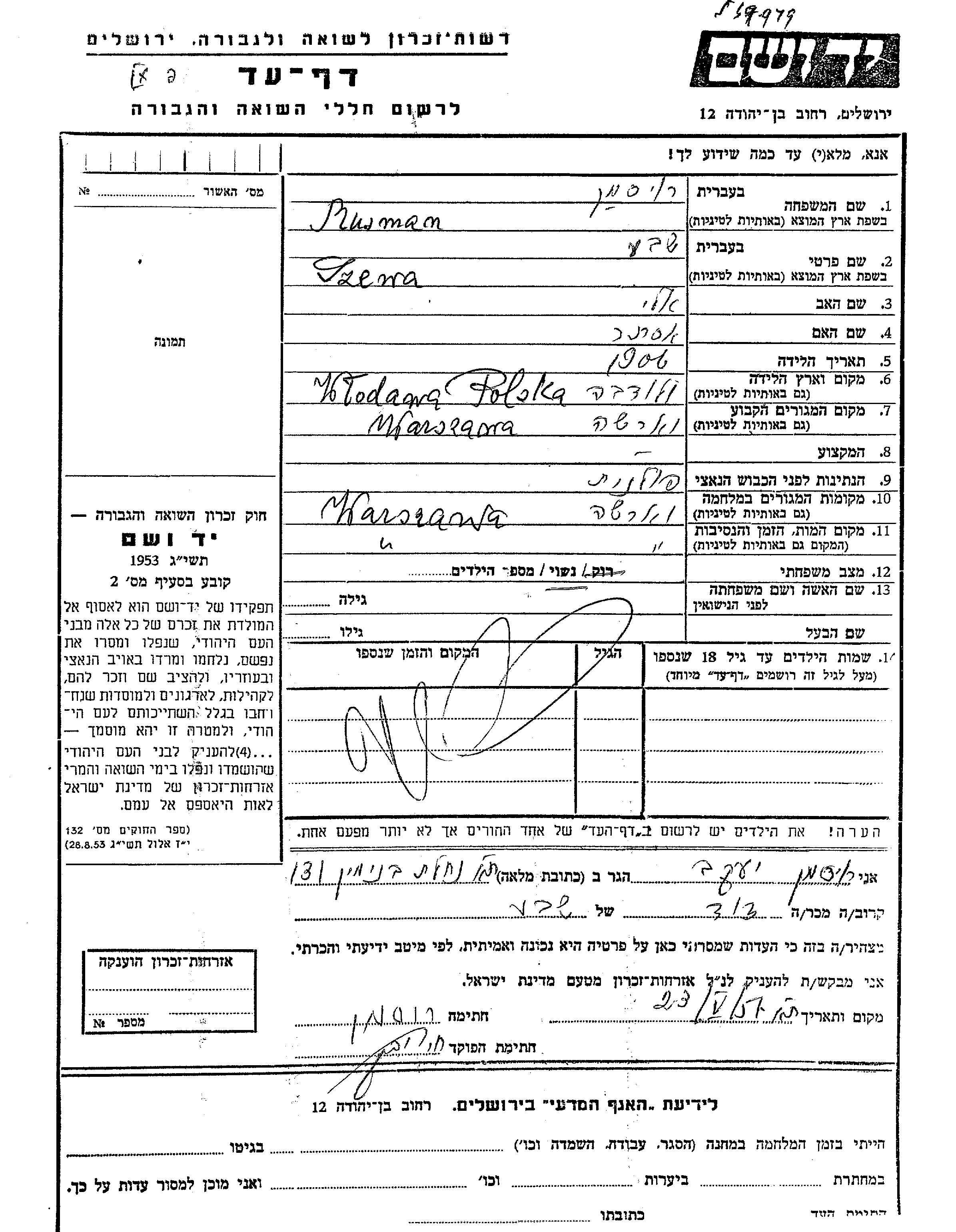 Szewa Rusman Rosman wurde in Wlodawa, Polen geboren. Vor dem Zweiten Weltkrieg lebte sie in Warszawa, Polen.