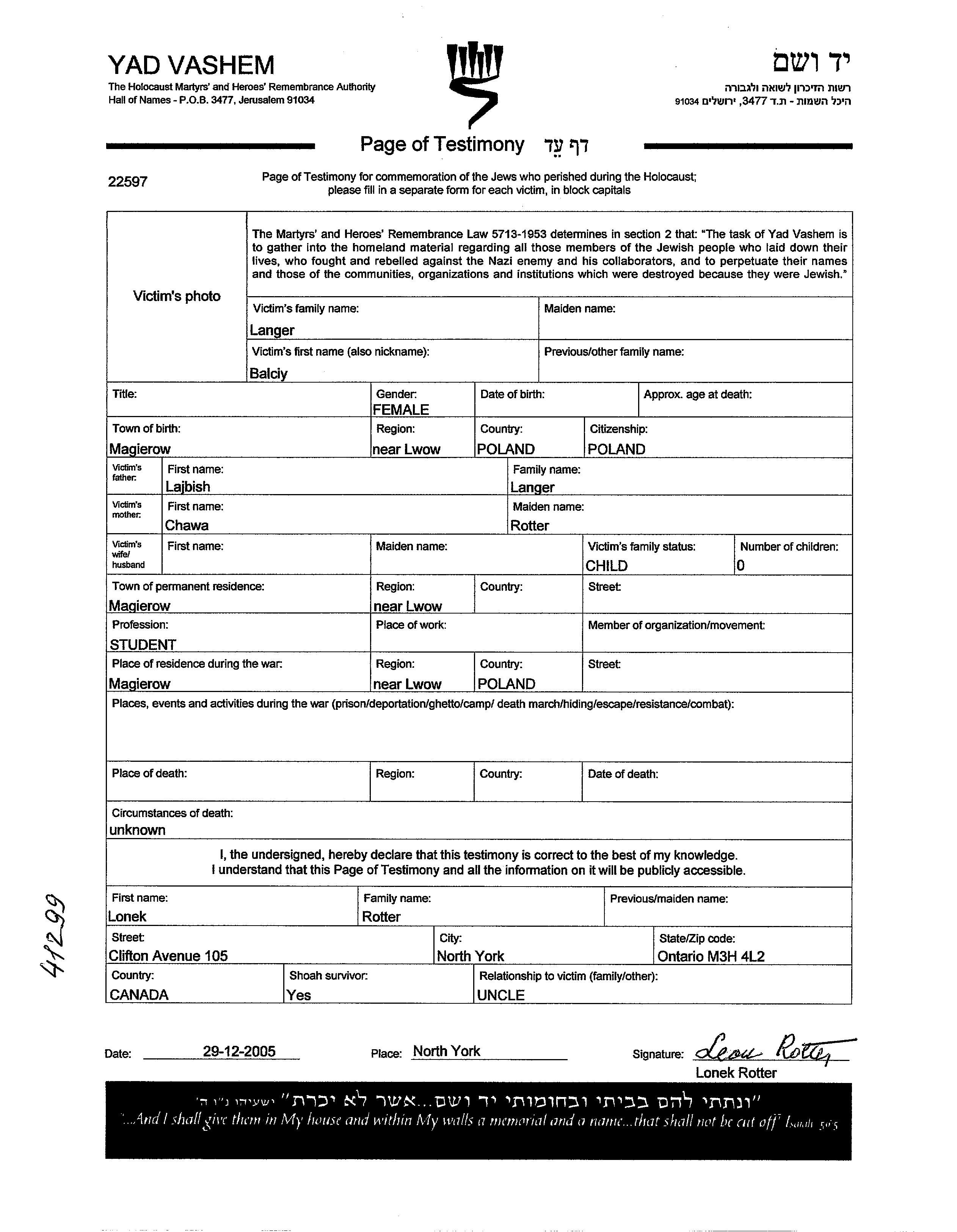 Balciy Langer wurde in Magierow, Polen geboren. Vor dem Zweiten Weltkrieg lebte sie in Magierow, Polen.