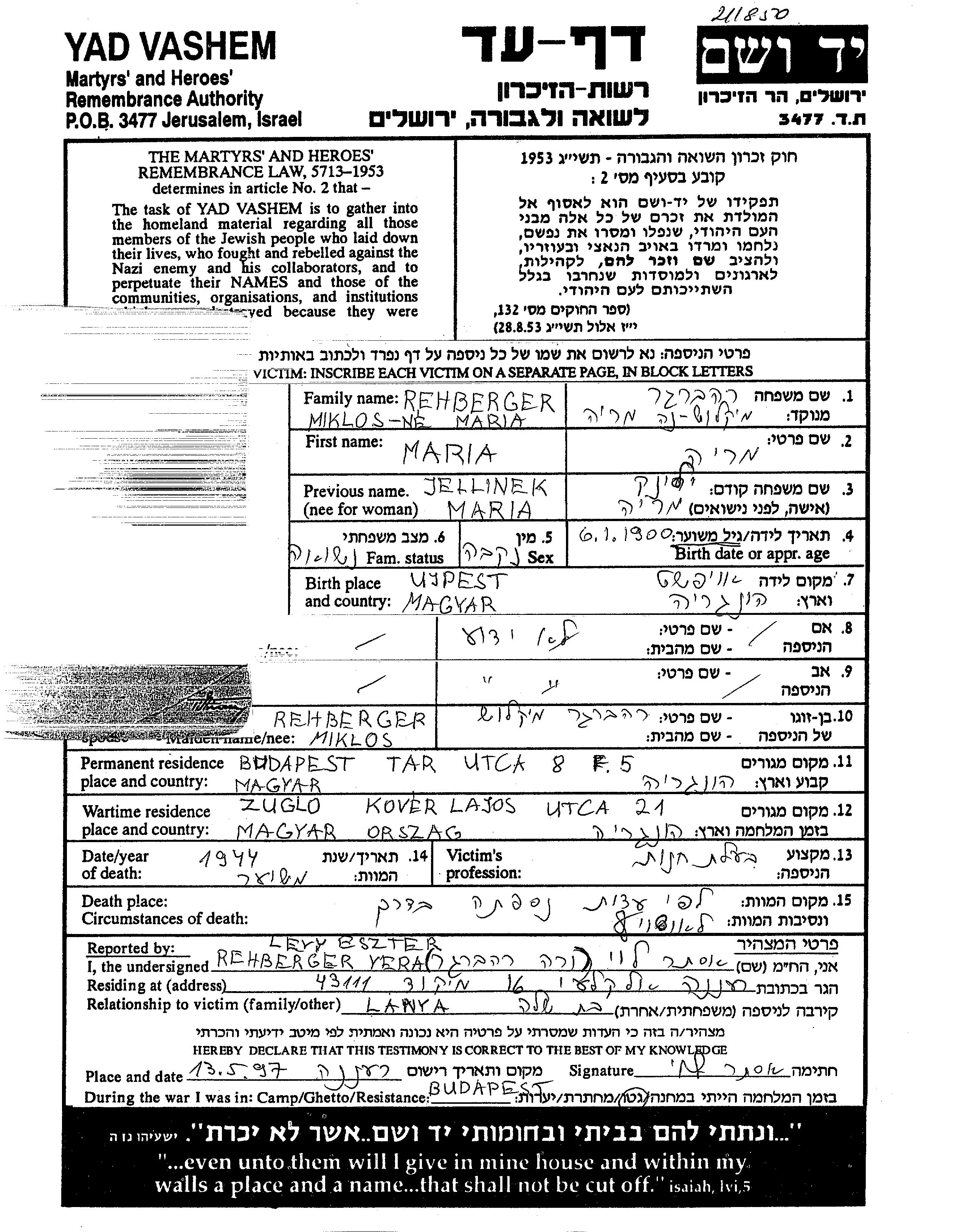 Miriam Maria Rehberger, geb. Jelinek wurde im Jahr 1900 in Ujpest, Ungarn geboren. Sie war Ladenbesitzer/-in. Vor dem Zweiten Weltkrieg lebte sie in Budapest, Ungarn.