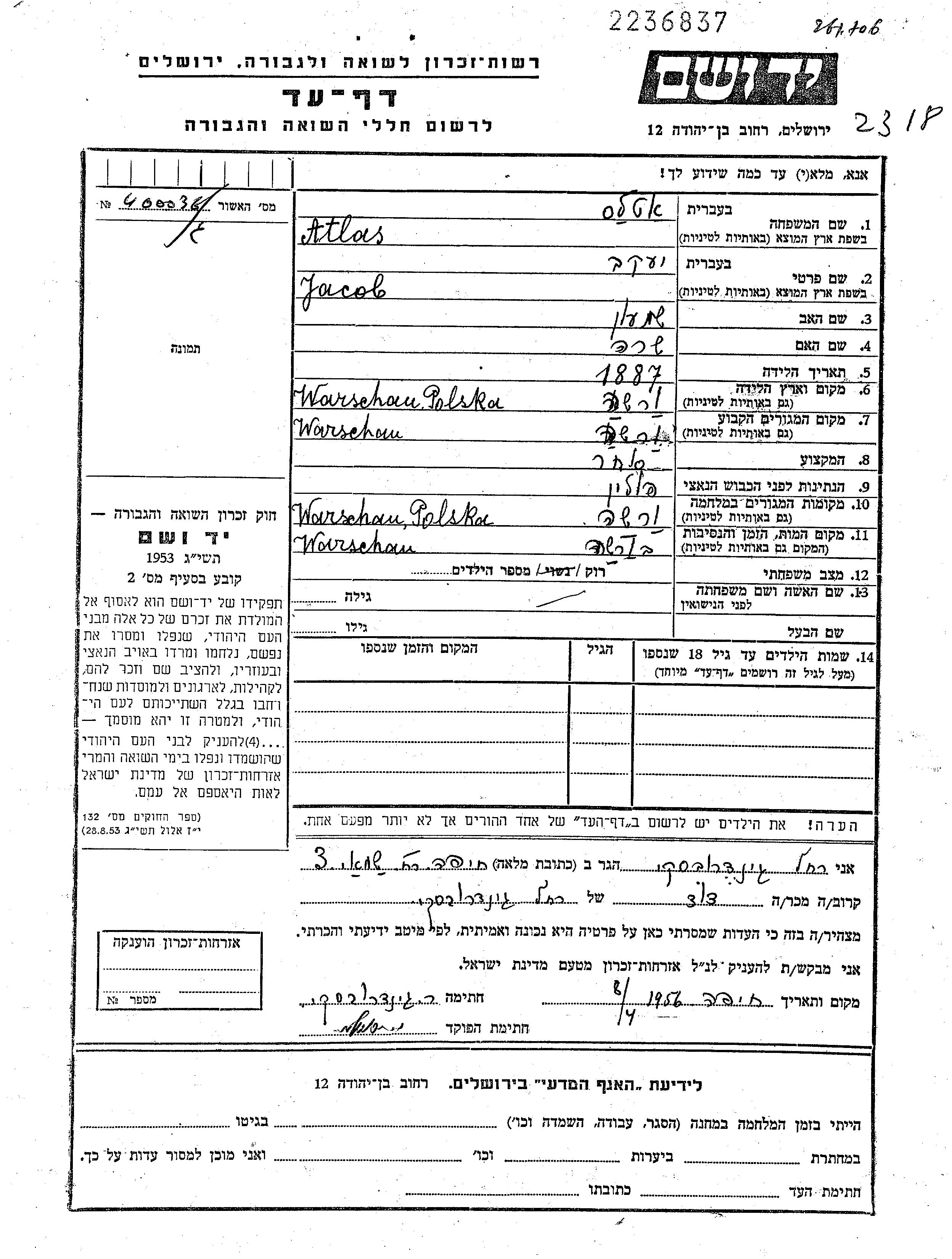 Jacob Atlas wurde im Jahr 1887 in Warszawa, Polen geboren. Er war der Sohn von Shimon und Sara. Er war Kaufmann/-frau und Ledig. Vor dem Zweiten Weltkrieg lebte er in Warszawa, Polen. Während des Krieges war er in Warszawa, Polen.