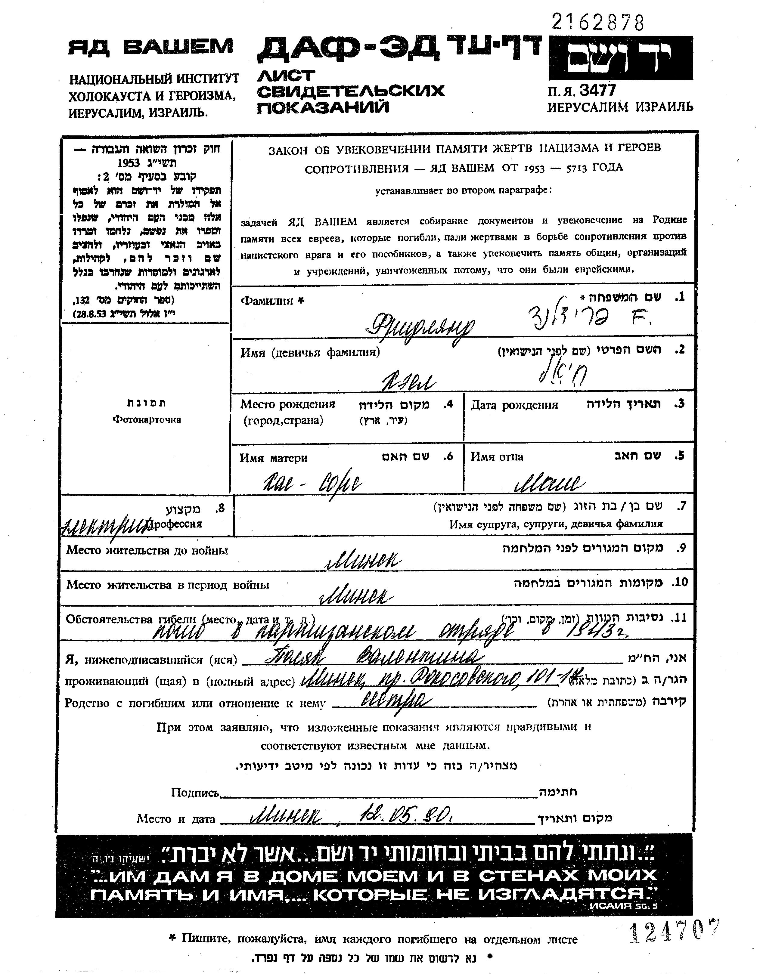 Yekhiel wurde in der Schoah ermordet. Todesort: Weißrussland (UdSSR) im Jahr 1943.