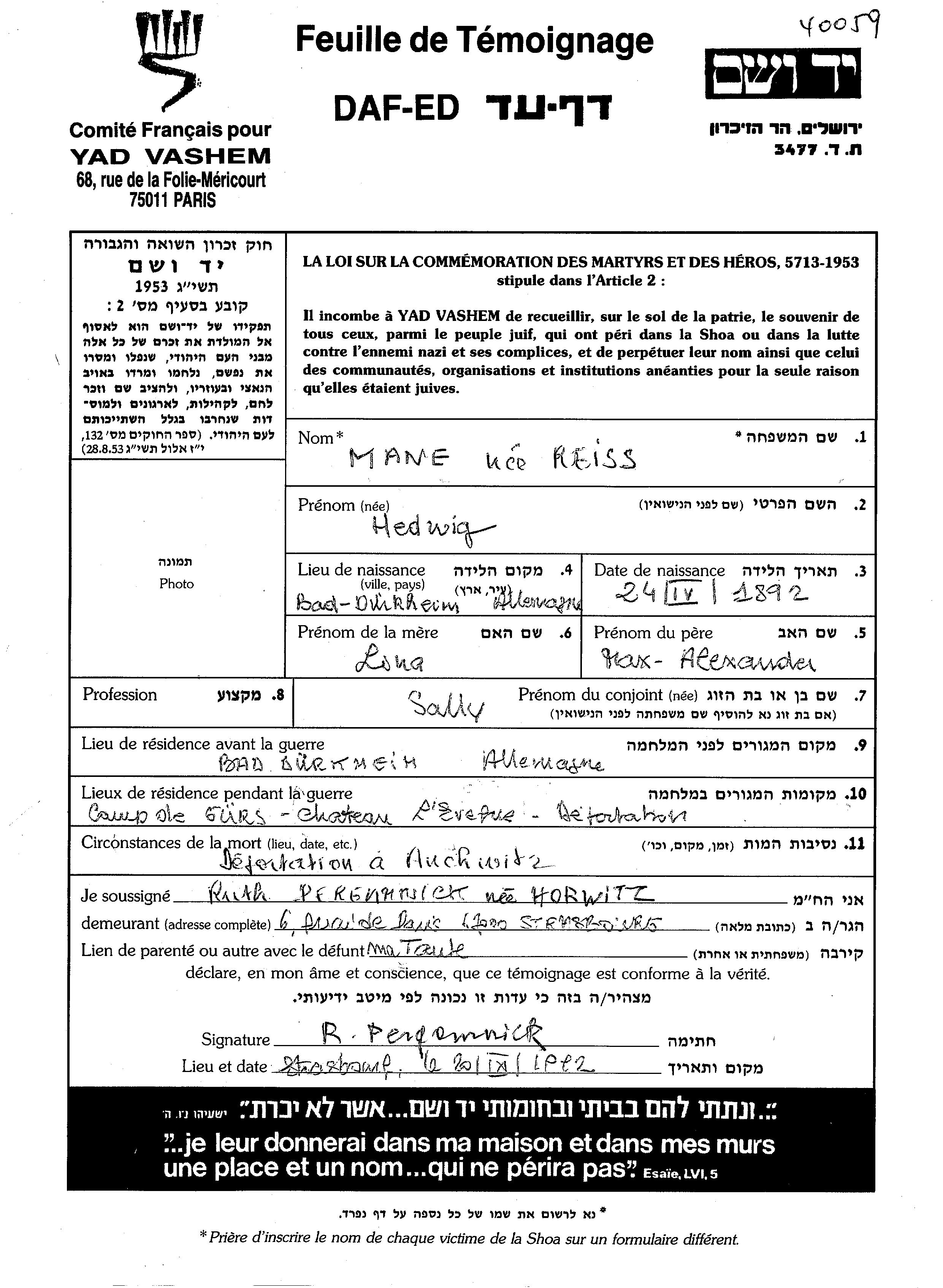 Hedvig Mané, geb. Reiss wurde in Bad Duerkheim, Deutsches Reich geboren. Vor dem Zweiten Weltkrieg lebte sie in Bad Duerkheim, Deutsches Reich.