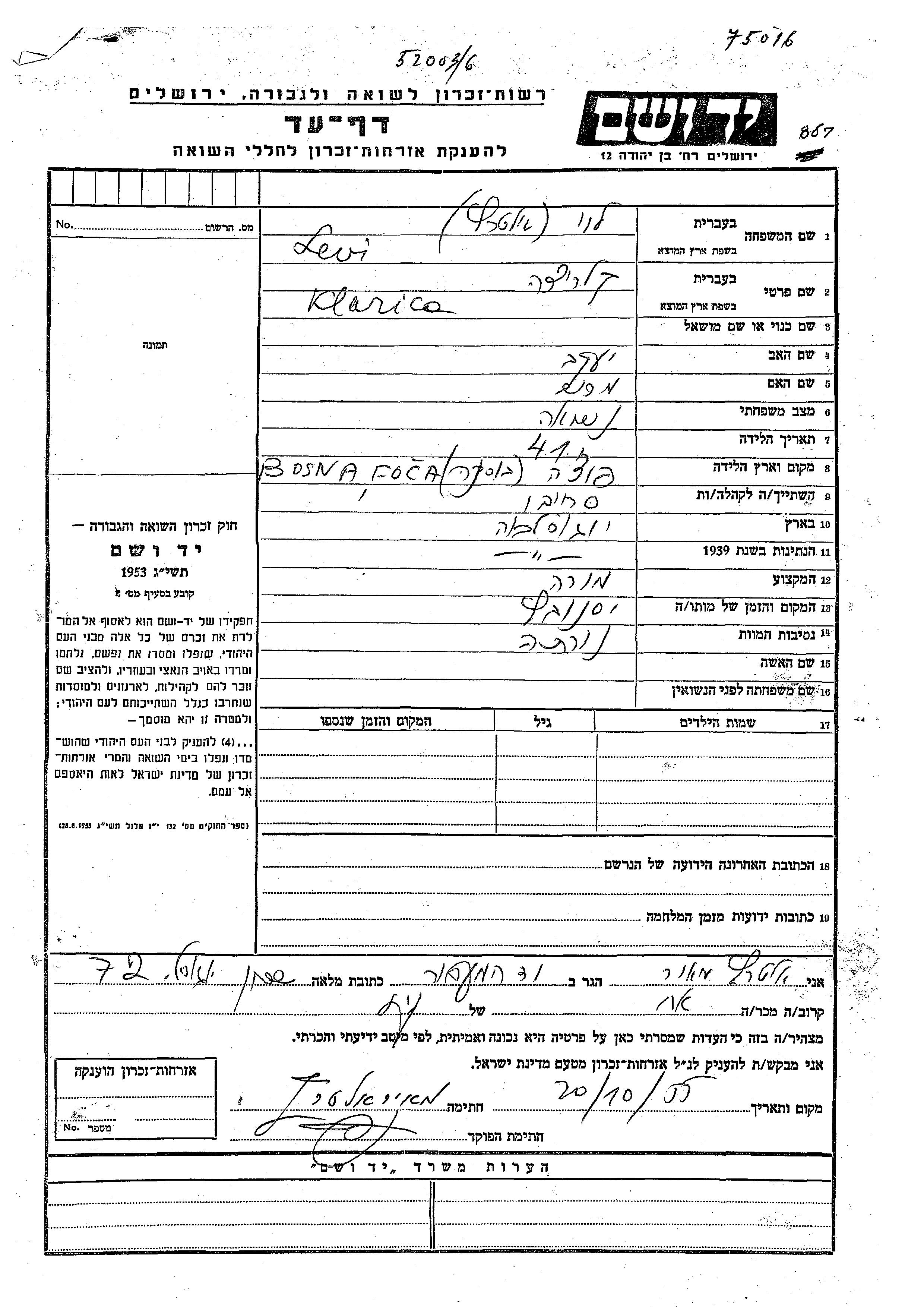 Klarica wurde in der Schoah ermordet. Todesort: Jasenovac, Jugoslawien.