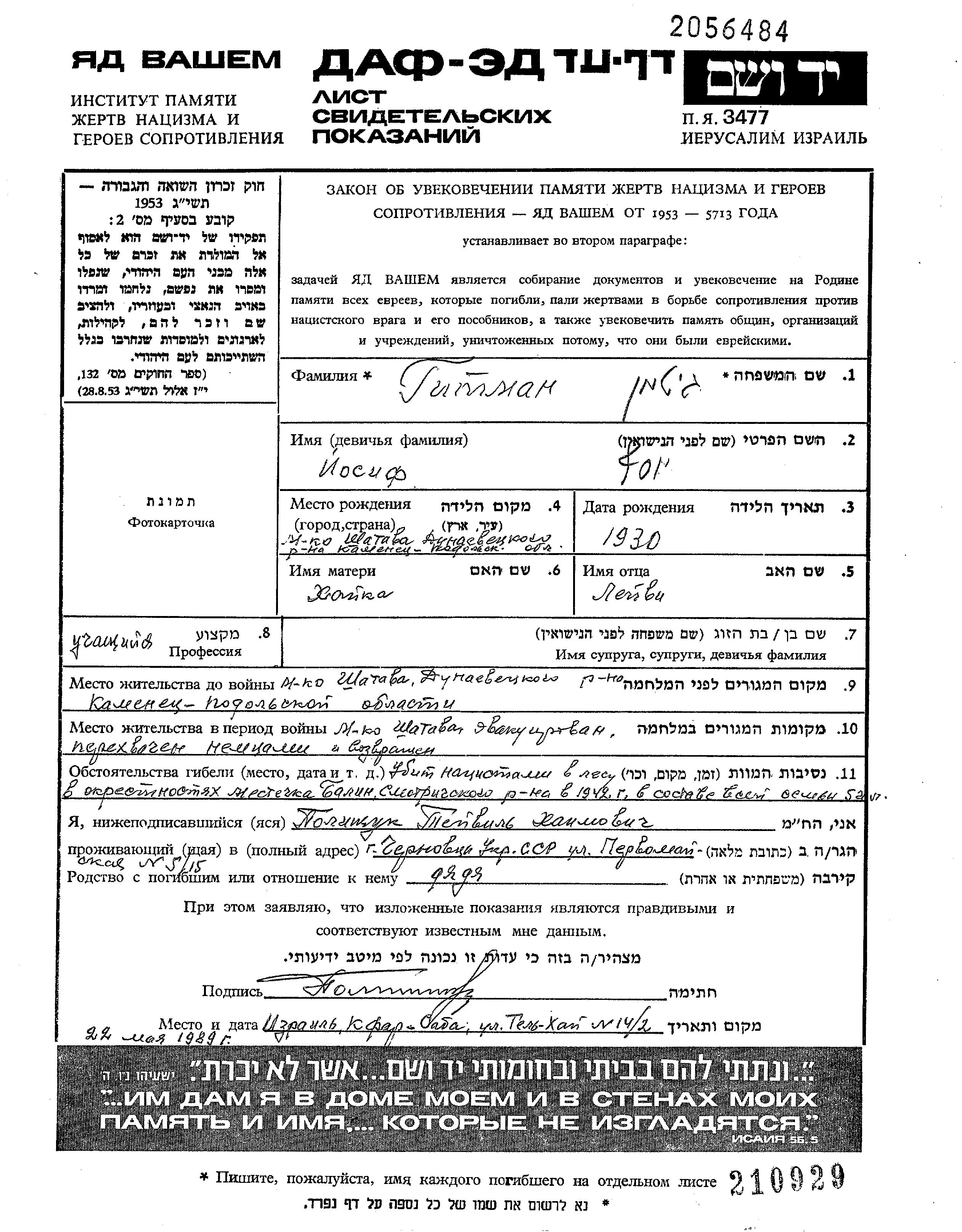 Gitman Yosif 1930 Shatava, Ukraine (UdSSR) Gedenkblatt