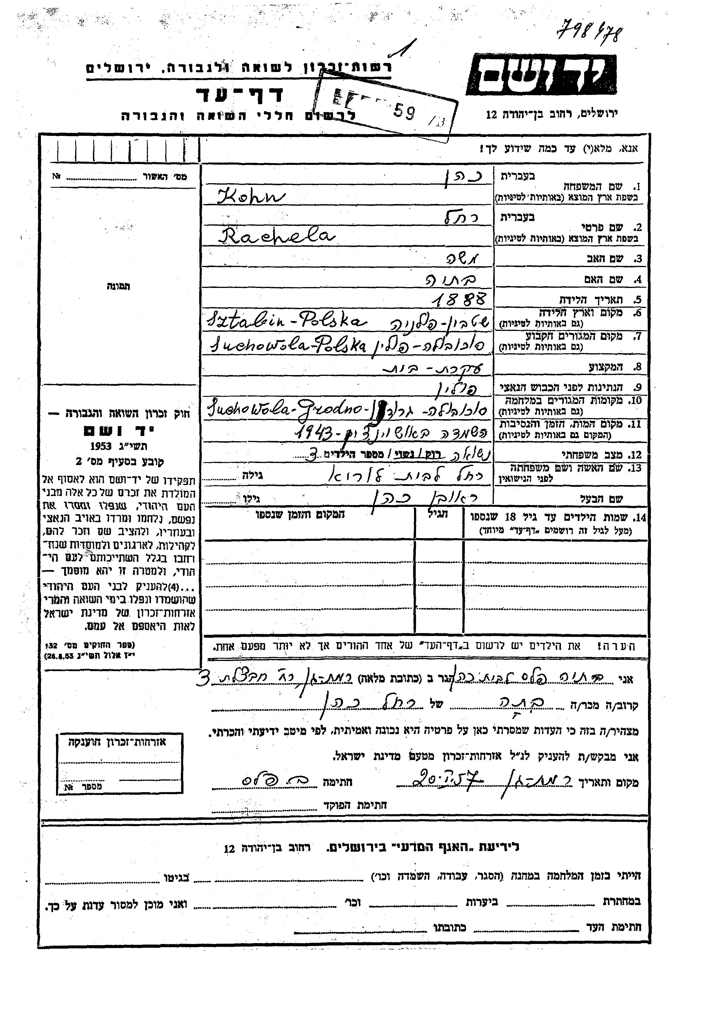 Rakhel Kohn, geb. Lurie wurde in Sztabin, Polen geboren. Sie war Hausfrau. Vor dem Zweiten Weltkrieg lebte sie in Suchowola, Polen.