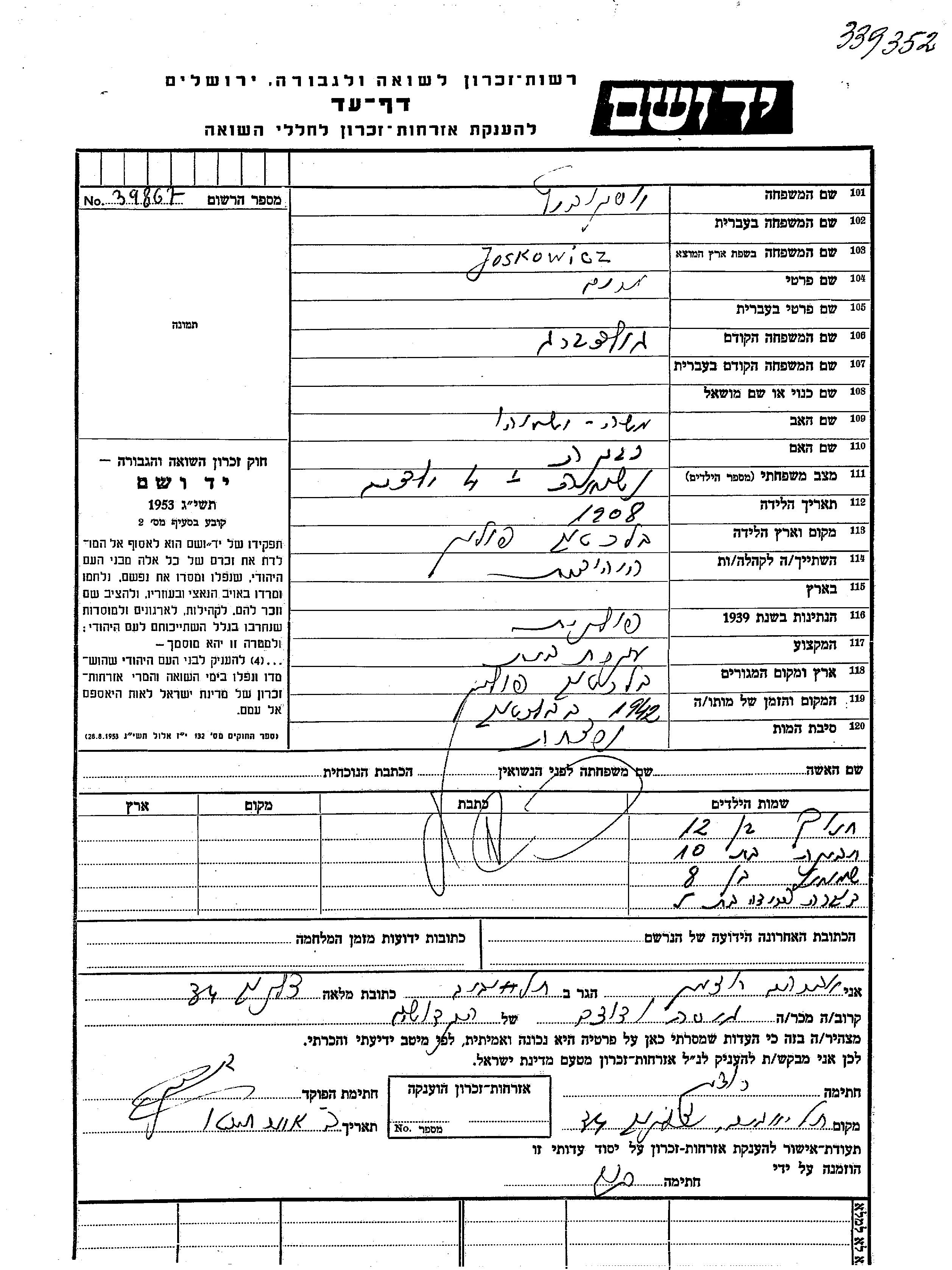Joskowicz Miriam 1908 Bełchatów, Polen Gedenkblatt