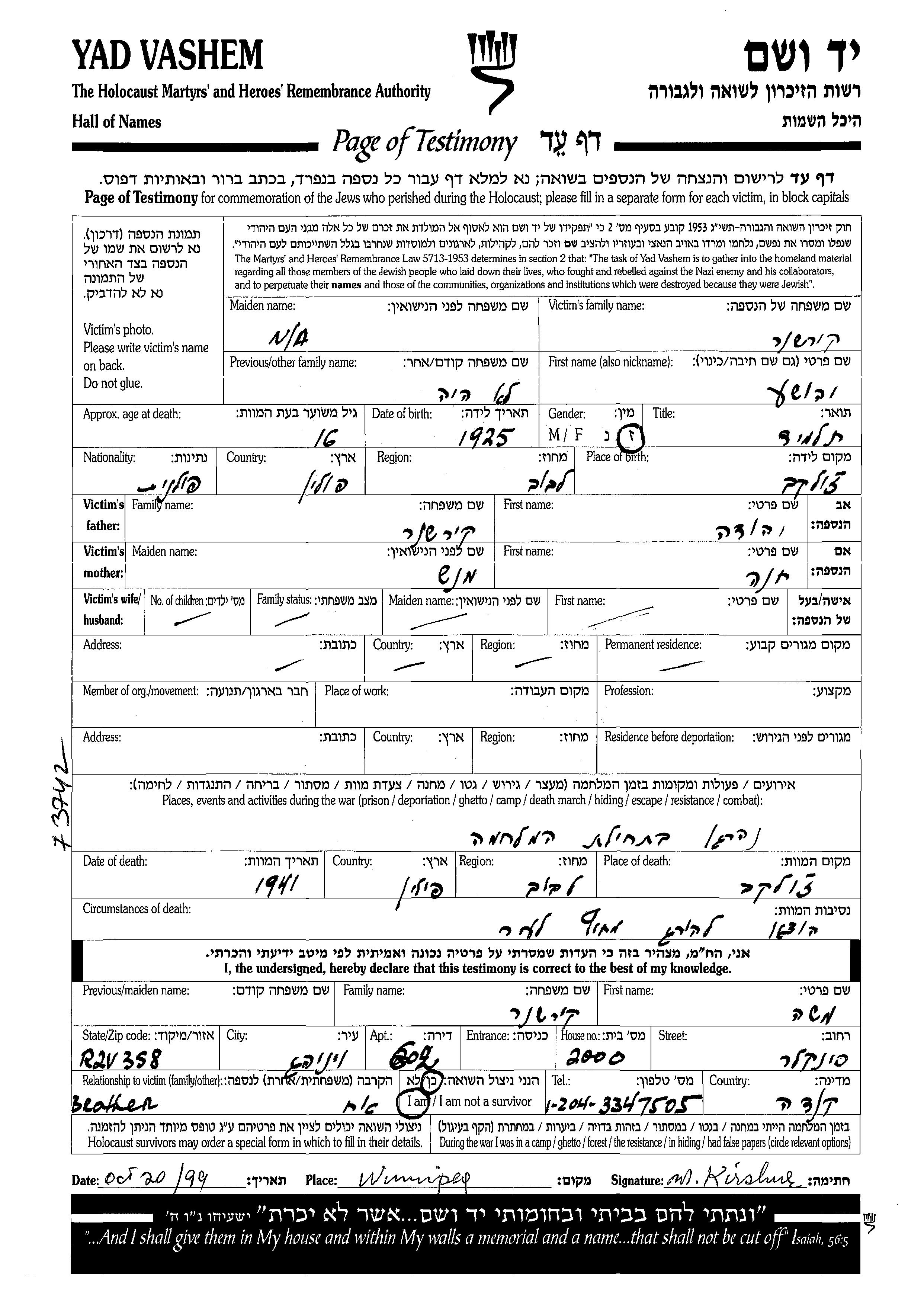 Kirshner | Yehoshua | 1925 | unbekannter Ort, | Gedenkblatt |