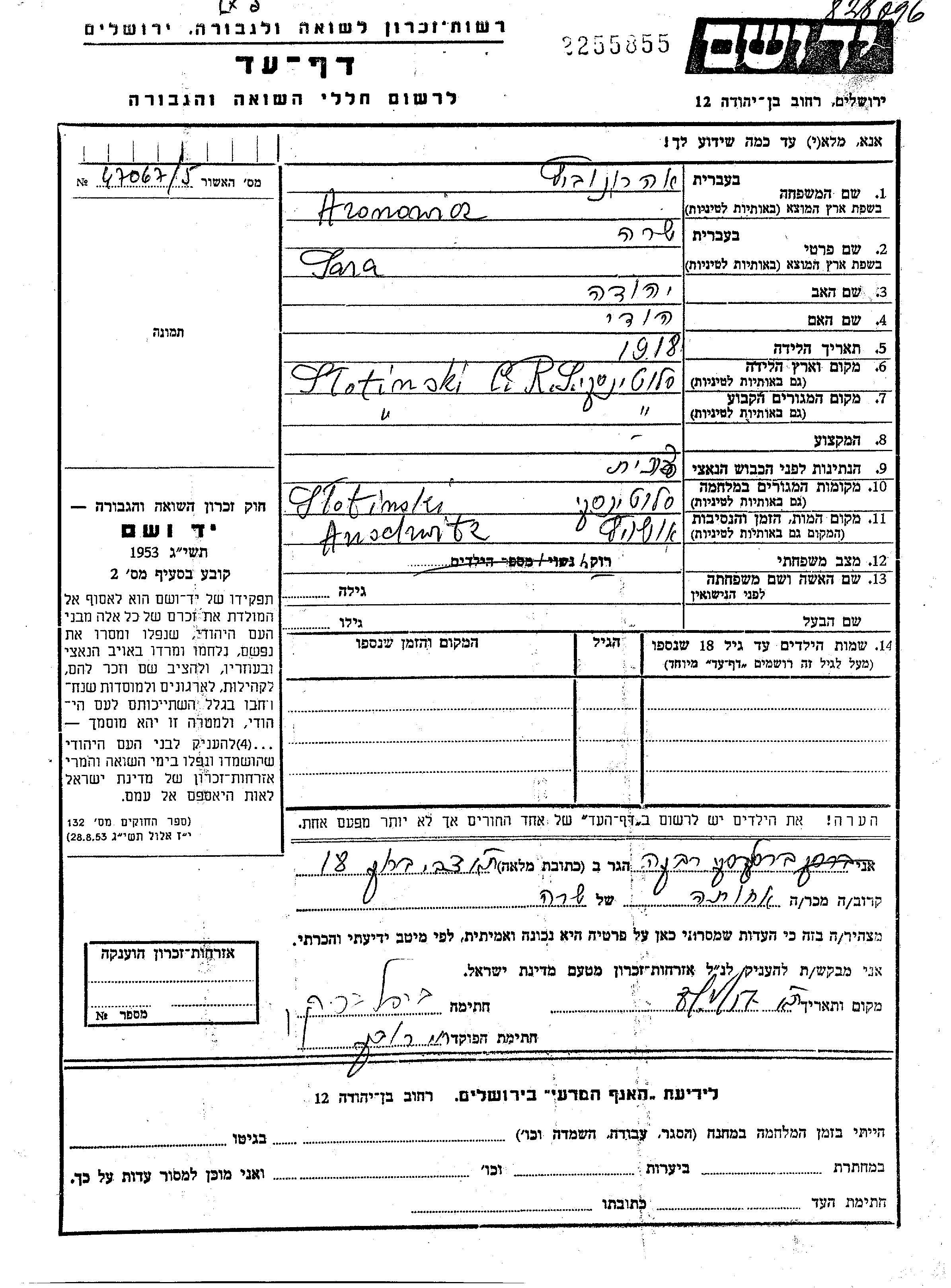 Aronowicz Sara 1918 Slatinske Doly, Tschechoslowakei Gedenkblatt