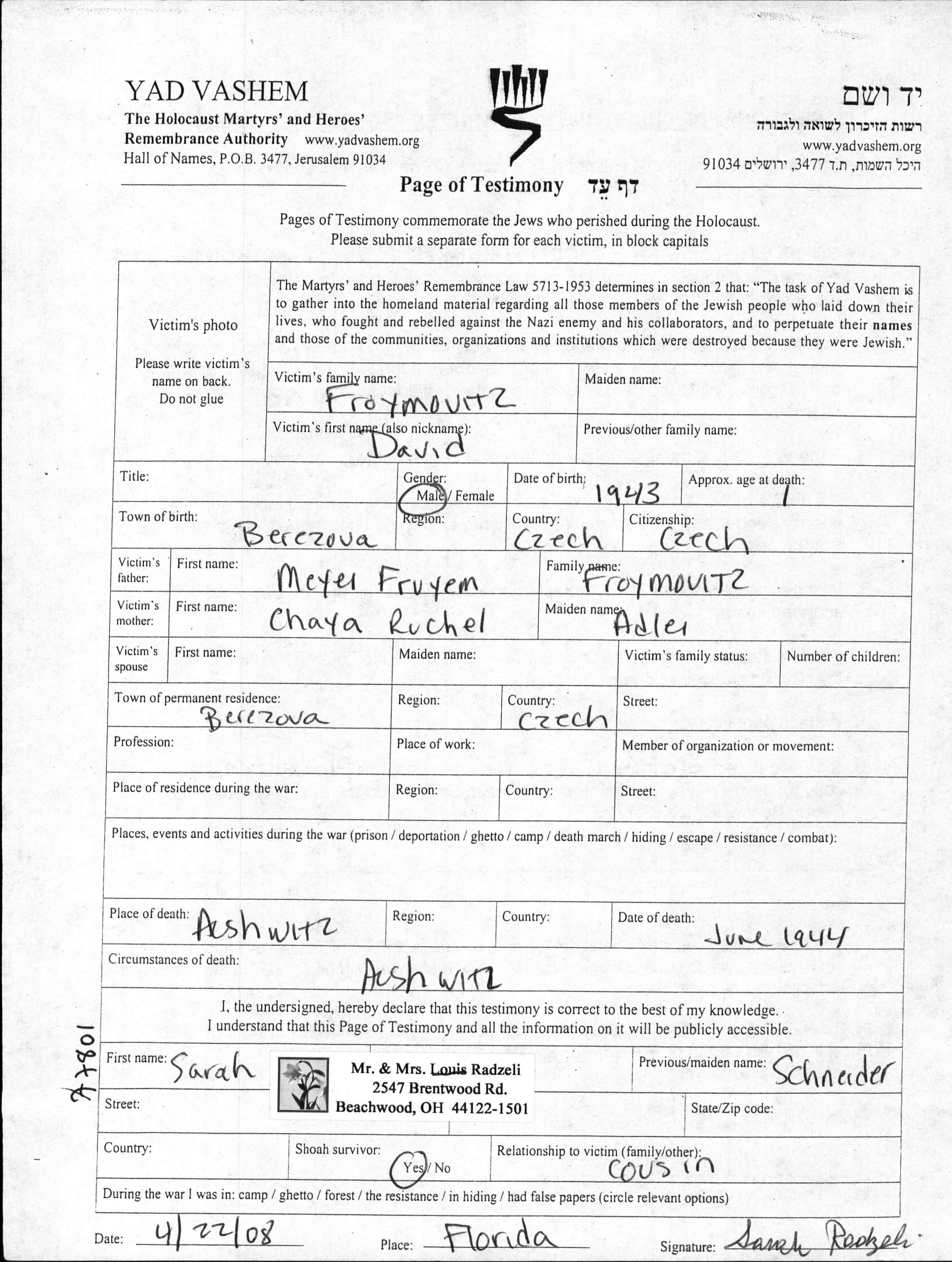 David Froymovitz wurde im Jahr 1943 in Berezova, Tschechoslowakei geboren. Vor dem Zweiten Weltkrieg lebte er in Berezovo, Tschechoslowakei.