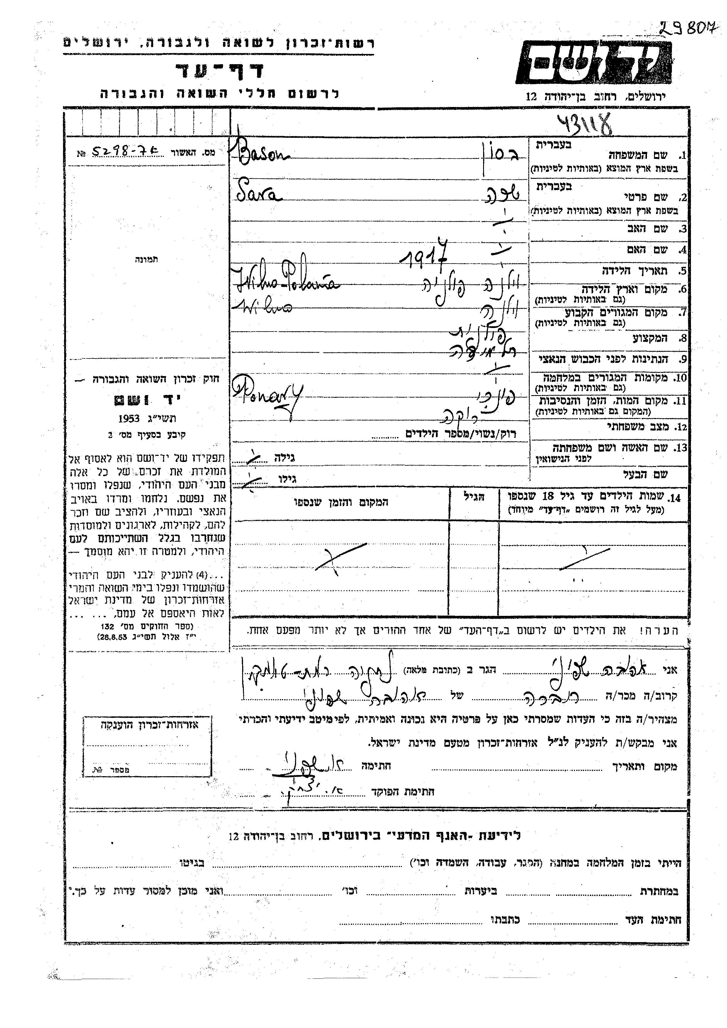 Sara Bason wurde im Jahr 1917 in Wilno, Polen geboren. Sie war Schüler/-in. Vor dem Zweiten Weltkrieg lebte sie in Wilno, Polen.
