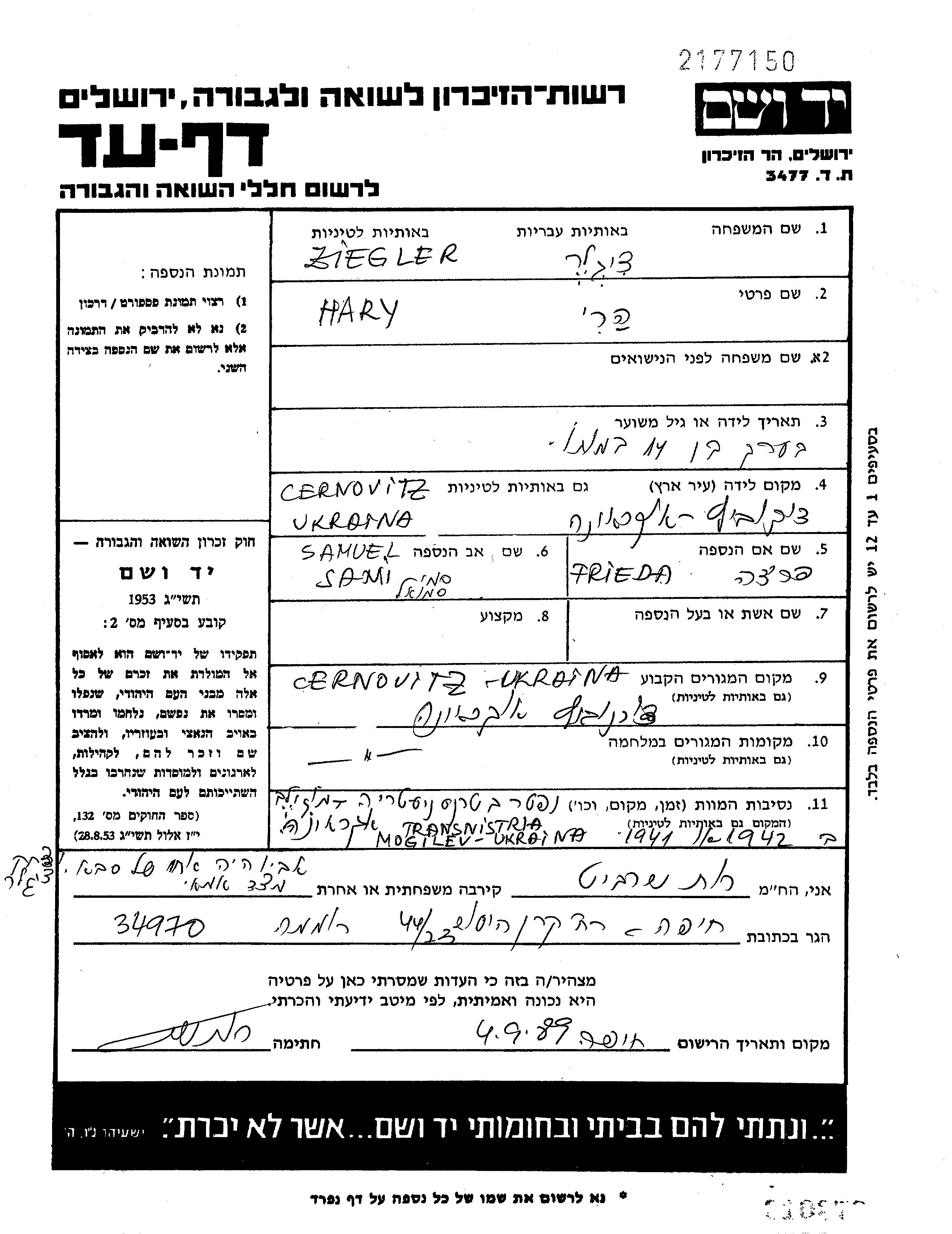 Hari Tzvi Ziegler Zigler wurde in Cernauti, Rumänien geboren. Er war Schüler/-in. Vor dem Zweiten Weltkrieg lebte er in Cernauti, Rumänien.