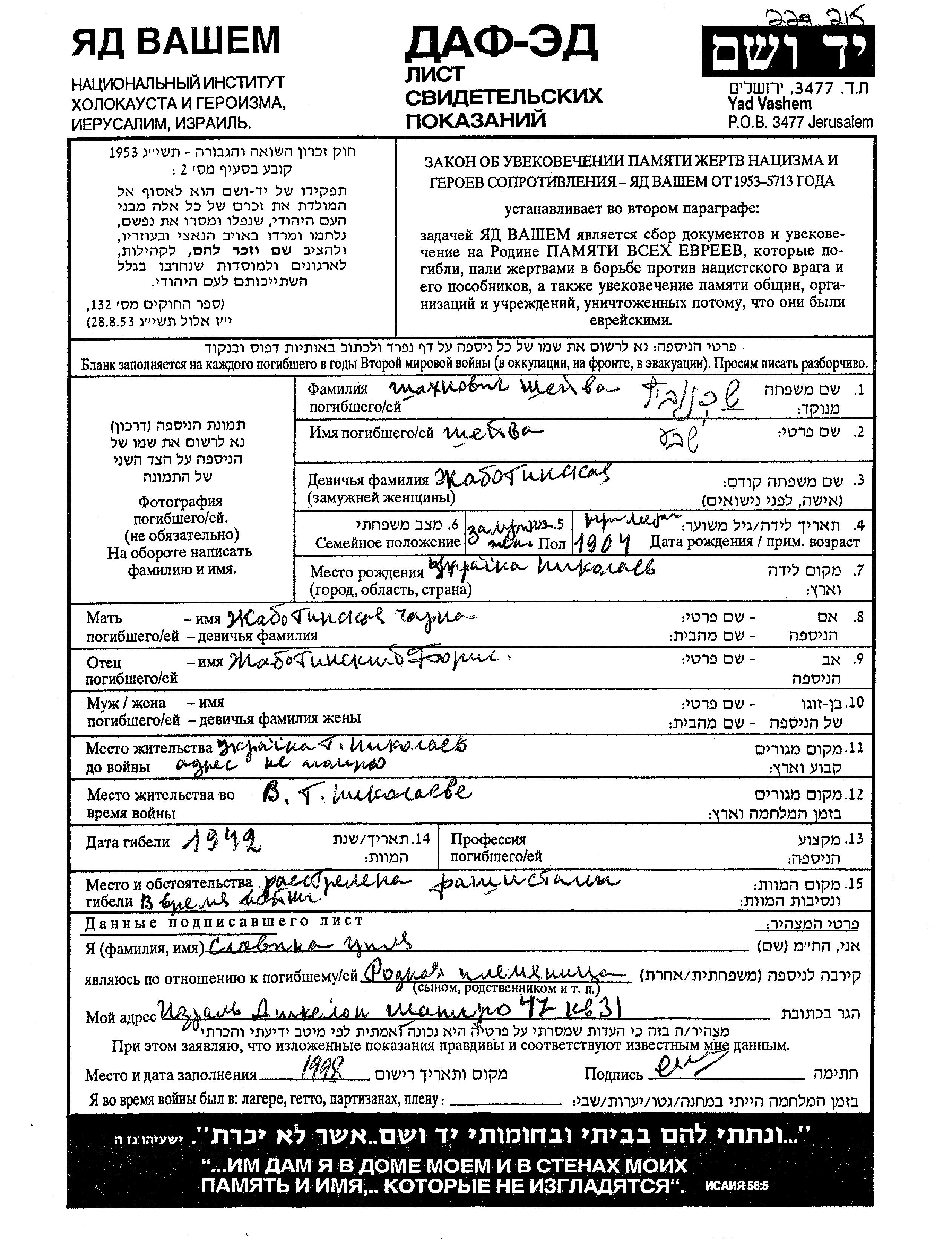 Shakhnovich | Sheiva | 1904 | Nikolayev, Ukraine (UdSSR) | Gedenkblatt |