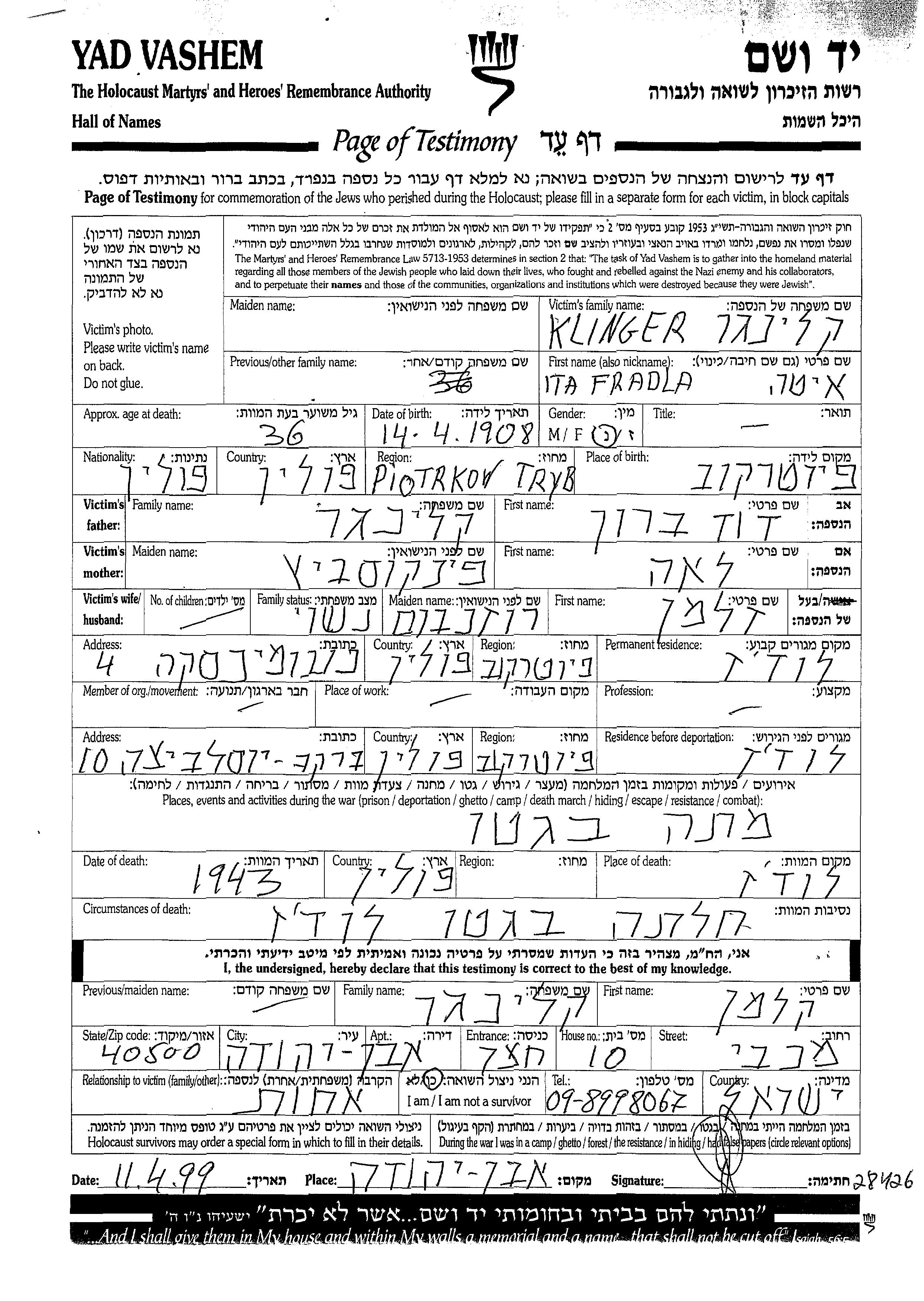 Ita Fradla Rozenbum, geb. Klinger wurde im Jahr 1908 in Piotrkow Trybunalski, Polen geboren. Vor dem Zweiten Weltkrieg lebte sie in Lodz, Polen.