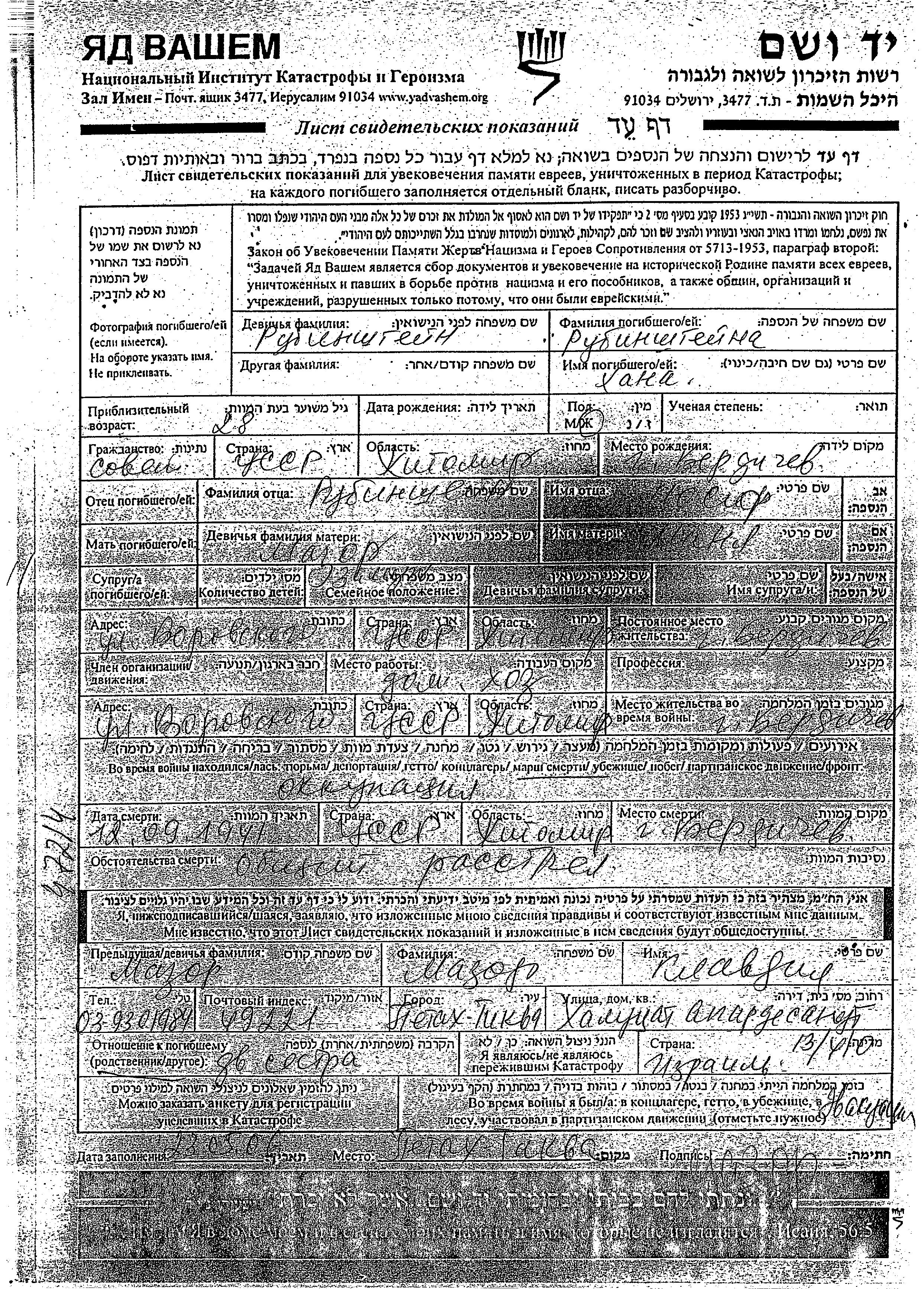 Khana Rubinshtein wurde im Jahr 1913 in Berdichev, Ukraine (UdSSR) geboren. Vor dem Zweiten Weltkrieg lebte sie in Berdichev, Ukraine (UdSSR).