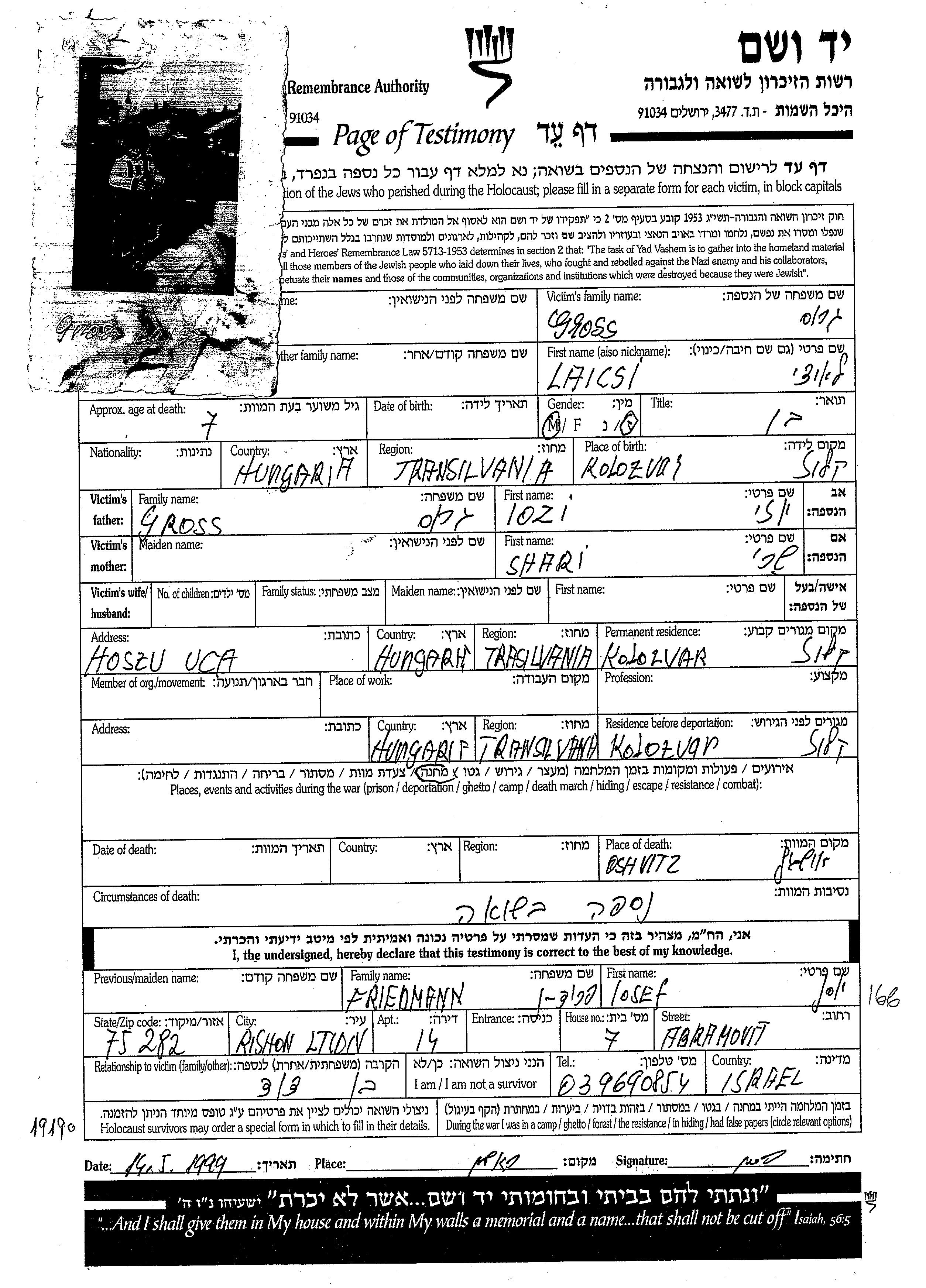 Laicsi wurde in der Schoah ermordet. Todesort: Auschwitz, Polen.