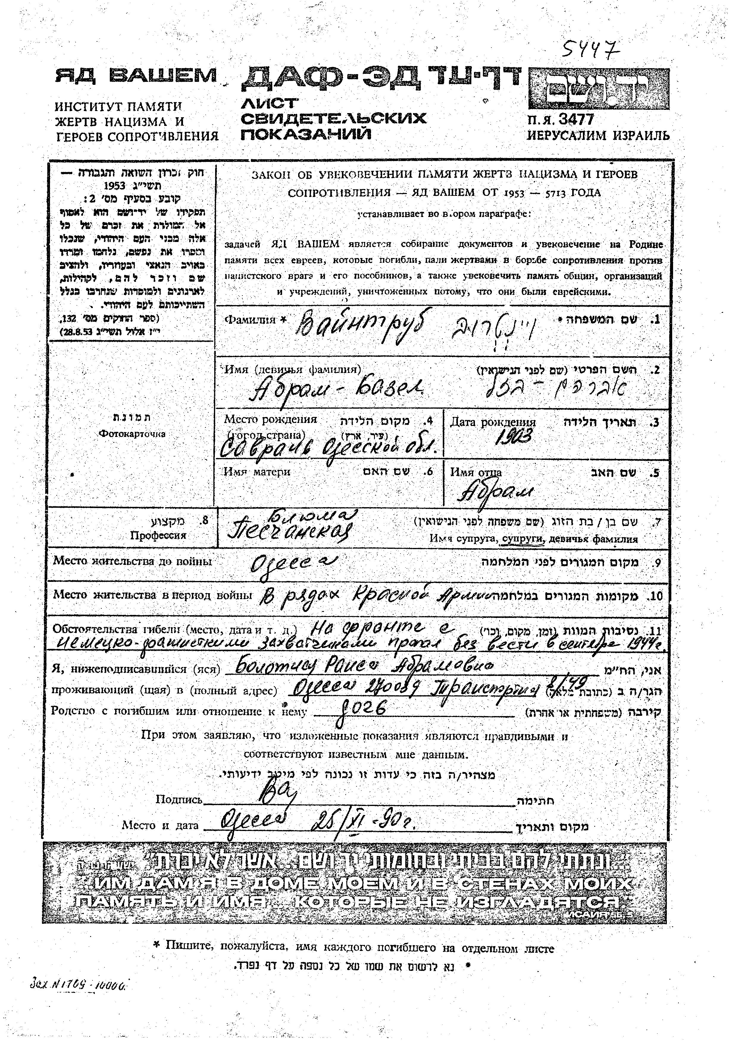 Bazel Avraham Vaintrub wurde im Jahr 1903 in Savran, Ukraine (UdSSR) geboren. Vor dem Zweiten Weltkrieg lebte er in Odessa, Ukraine (UdSSR).