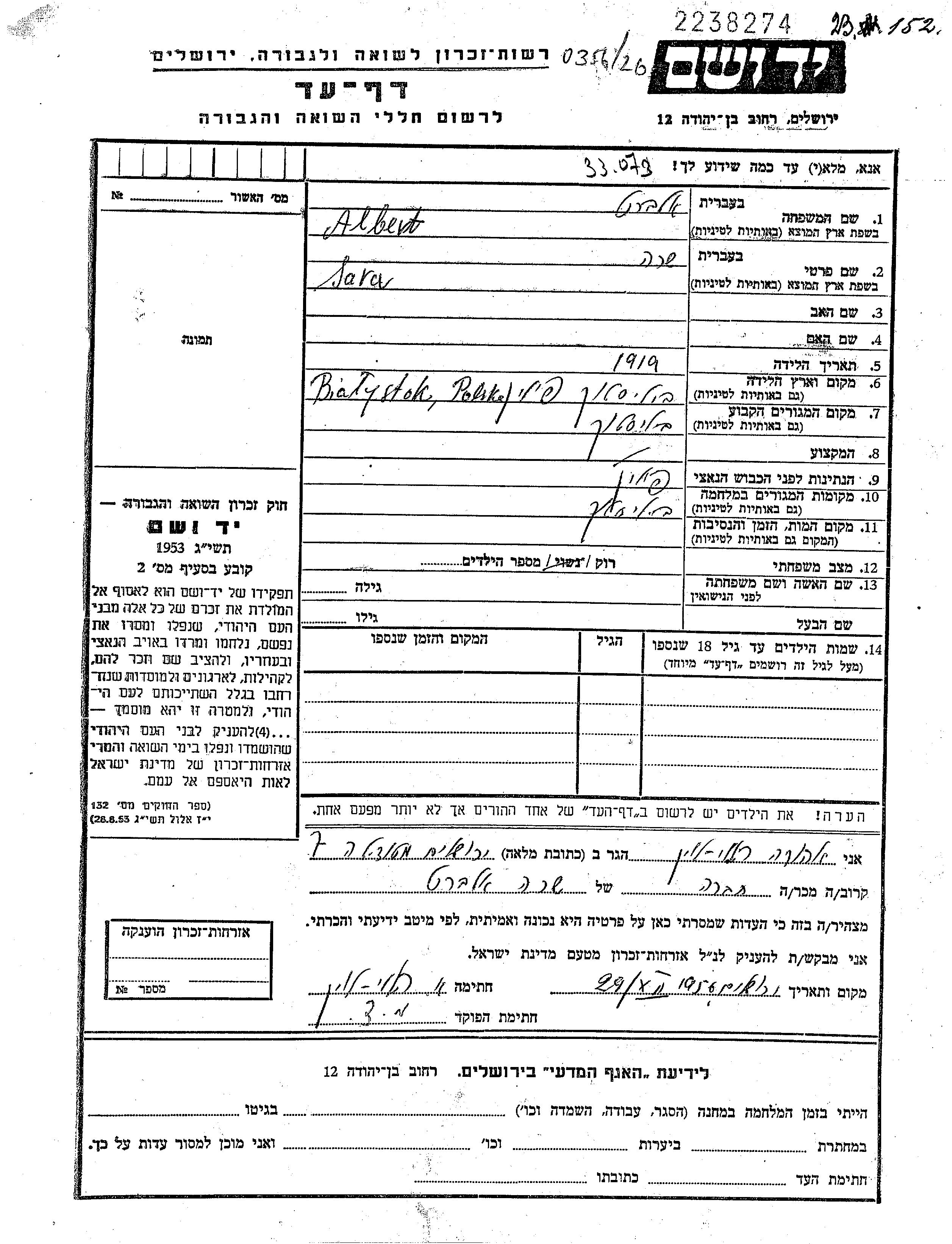 Sara Elbert wurde im Jahr 1919 in Bialystok, Polen geboren. Vor dem Zweiten Weltkrieg lebte sie in Bialystok, Polen. Während des Krieges war sie in Bialystok, Polen.