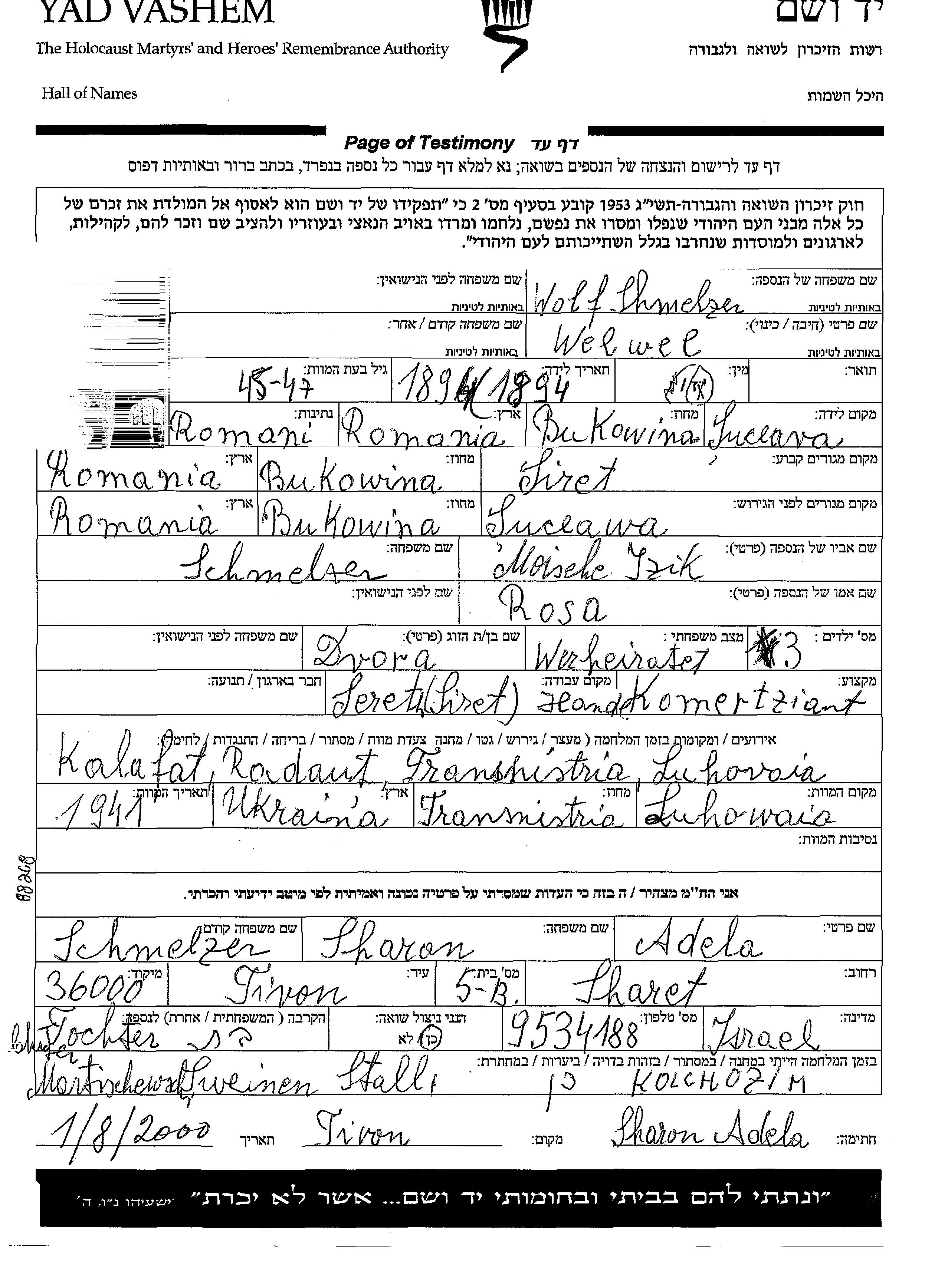 Volf Schmelzer wurde im Jahr 1894 in Suceava, Rumänien geboren. Er war Kaufmann/-frau. Vor dem Zweiten Weltkrieg lebte er in Siret, Rumänien.